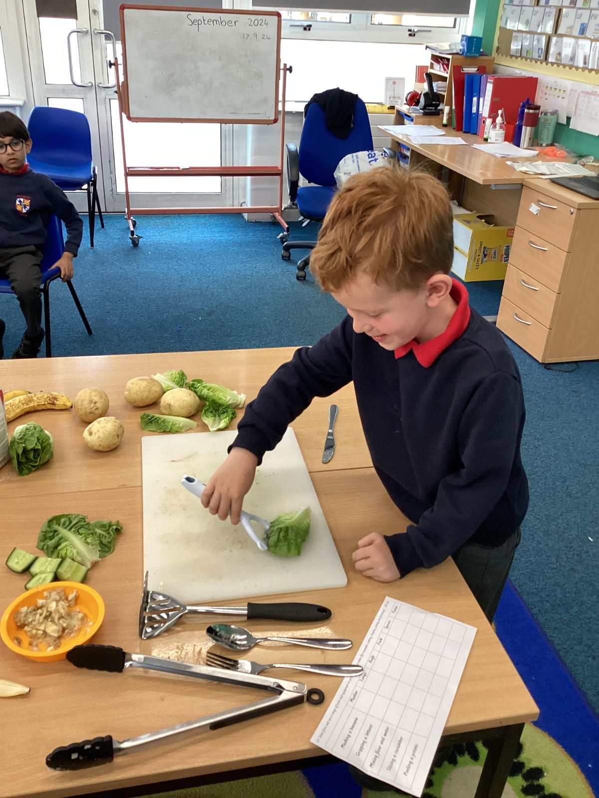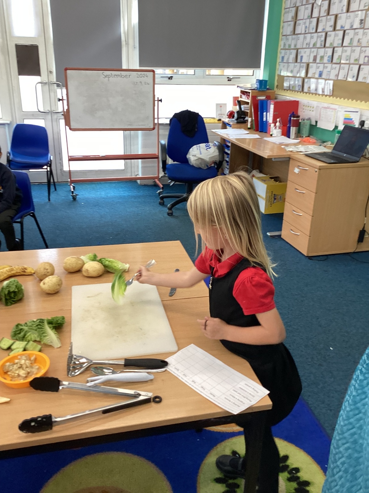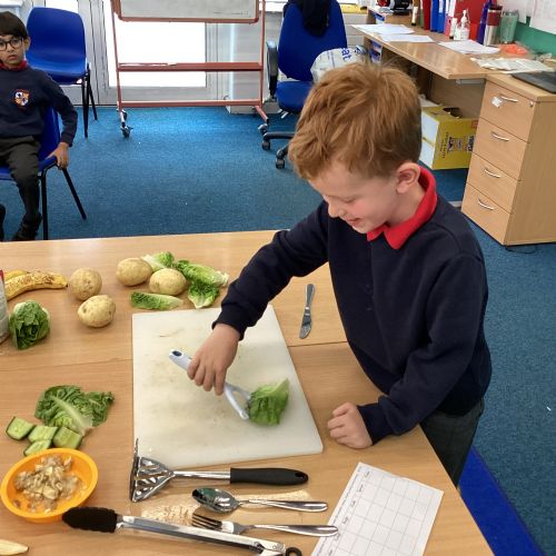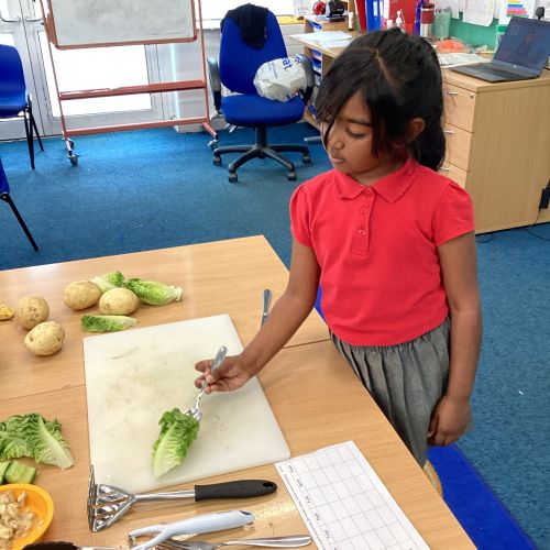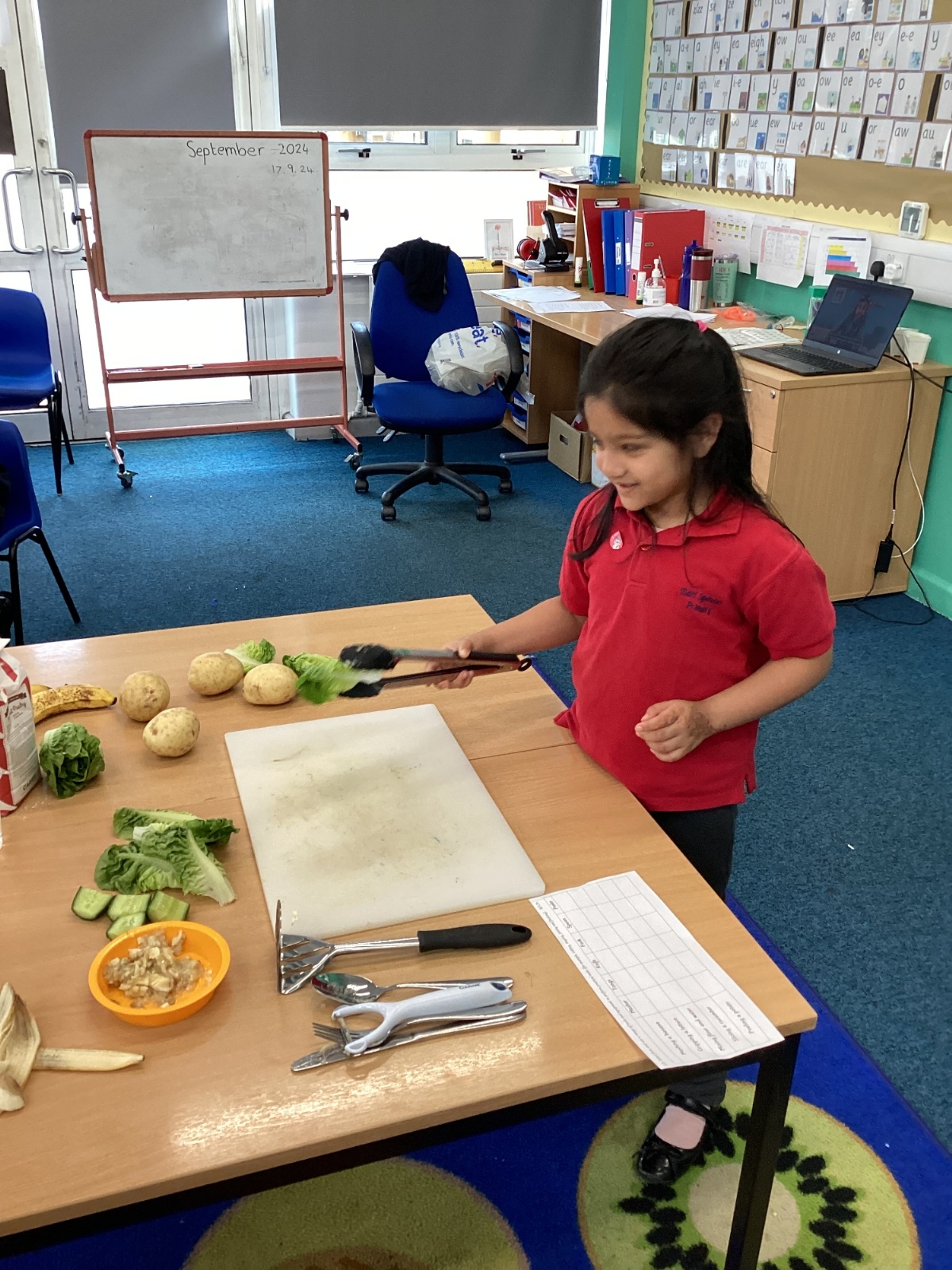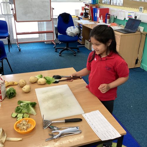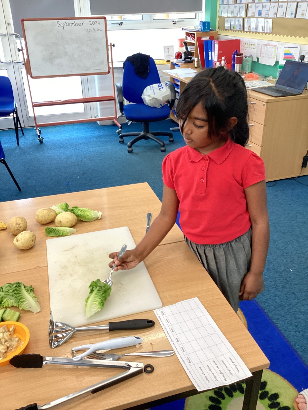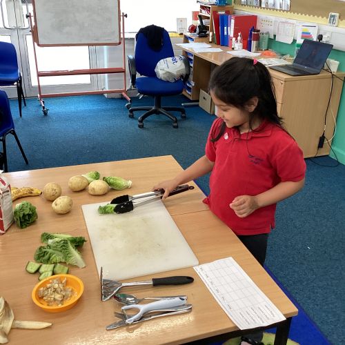 We used utensils such as peelers, tongs, knives, forks and spoons to see which ones were useful for certain jobs like gripping a lettuce leaf or peeling a potato.