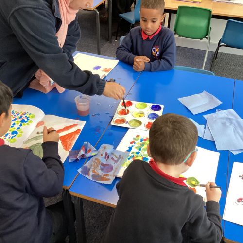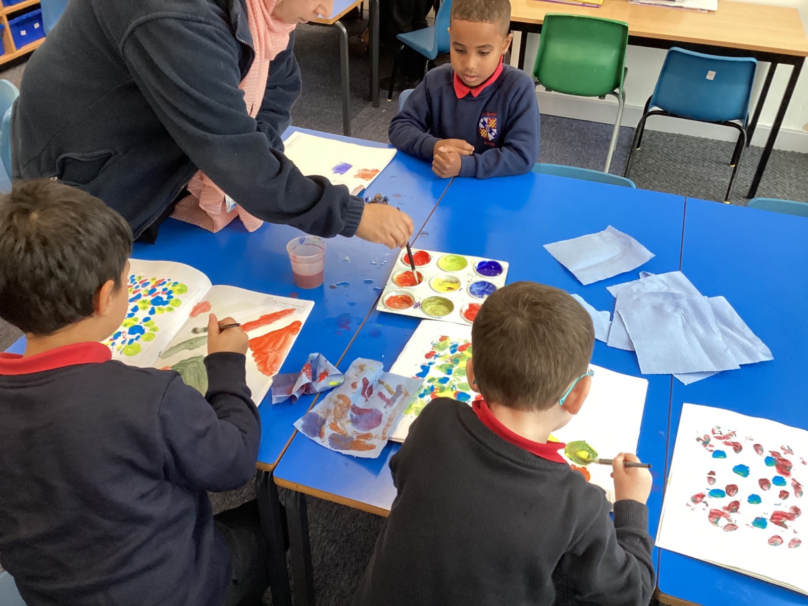 In art we have been mixing primary colours to create secondary colours. Here you can see the different shades we have been creating.