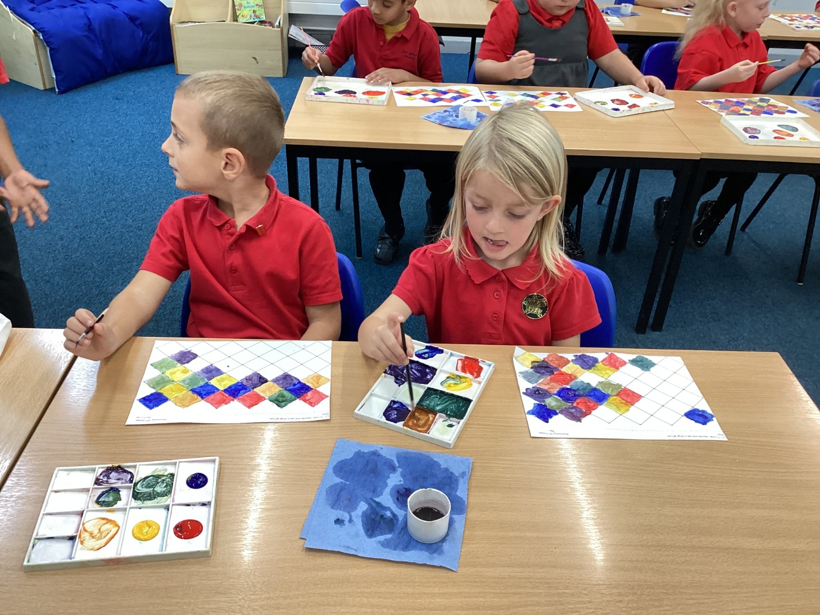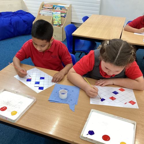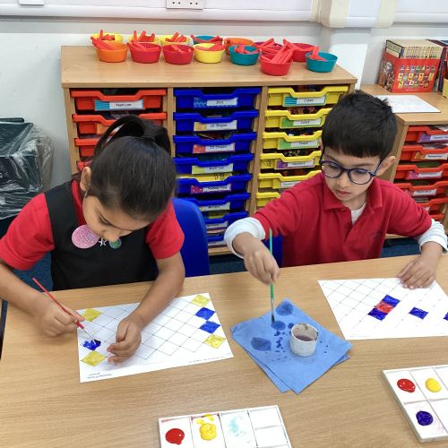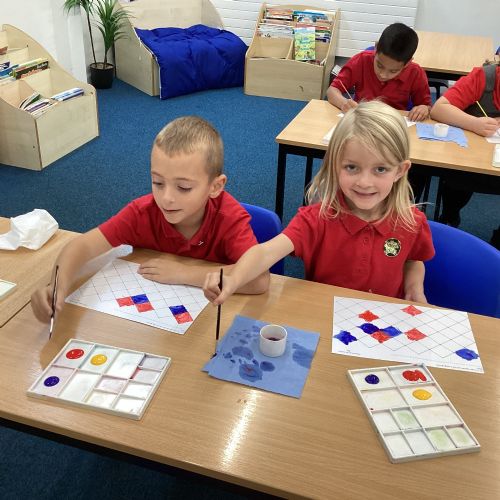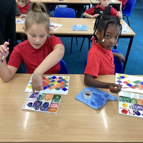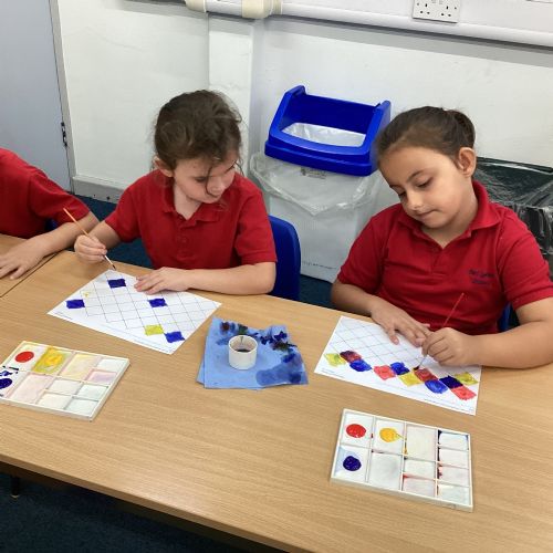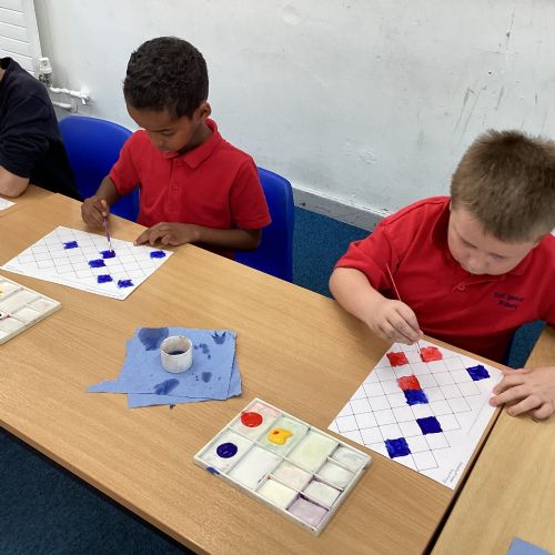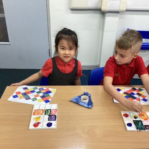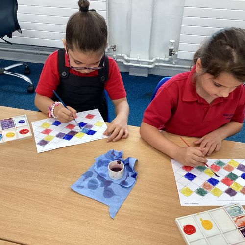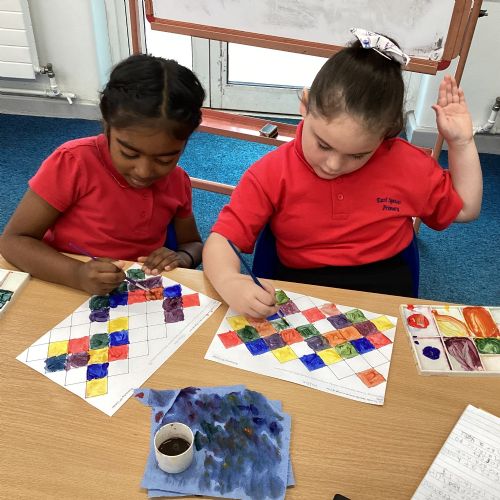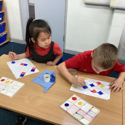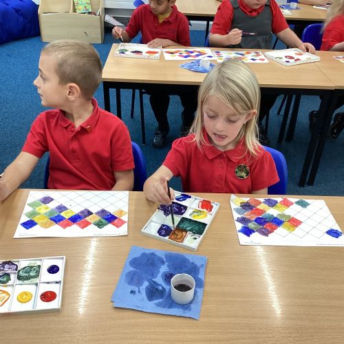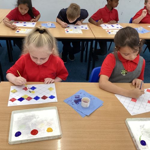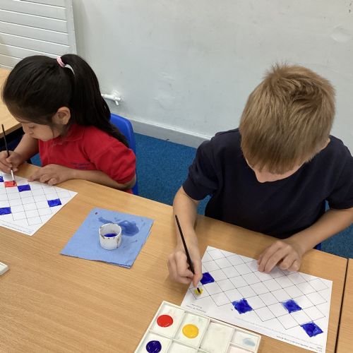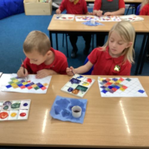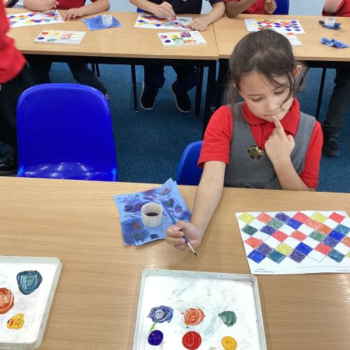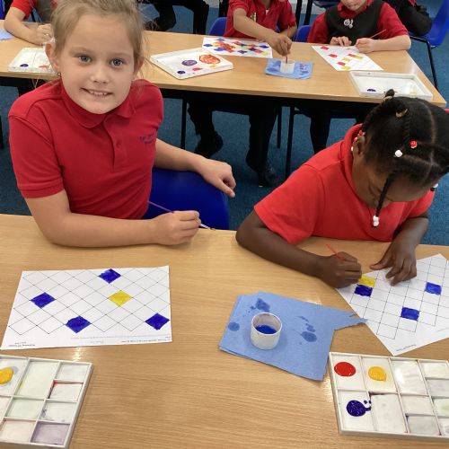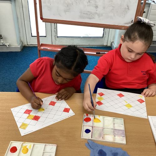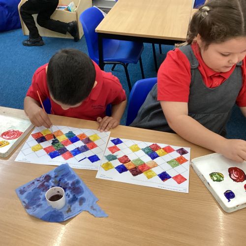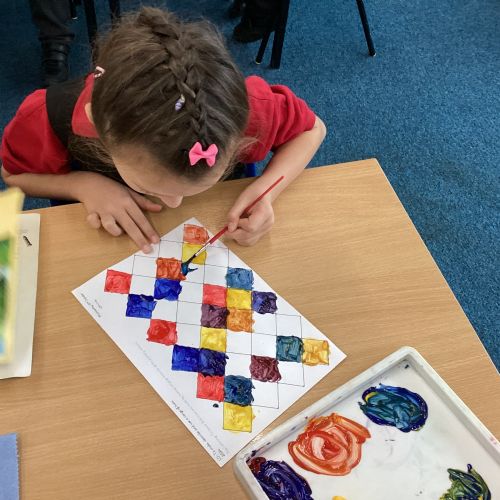 In Art and Design this week we made artwork using primary colours and secondary colours with a range of hues. Our challenge was not to let 2 sections with the same colour or hue touch each other.
