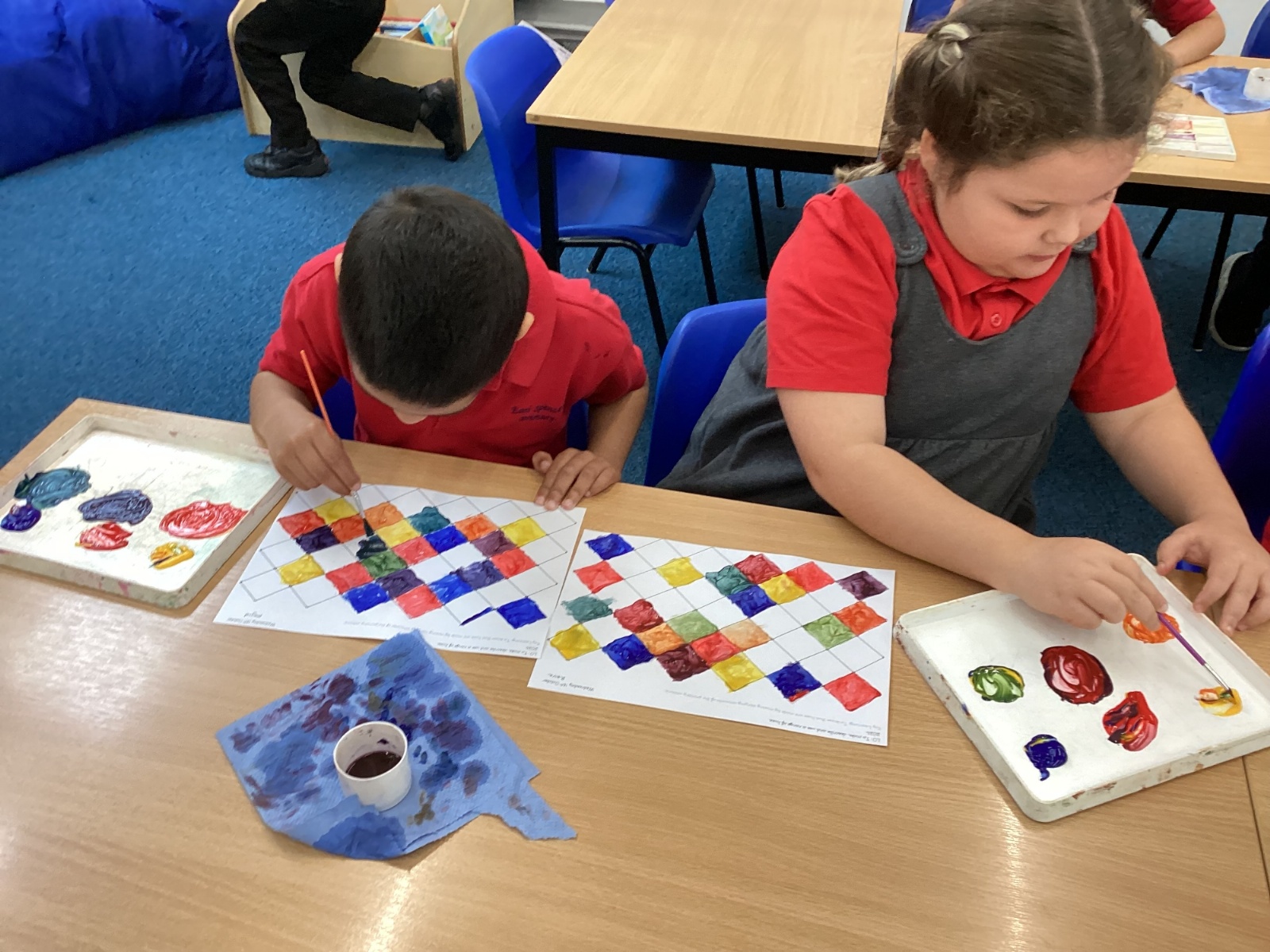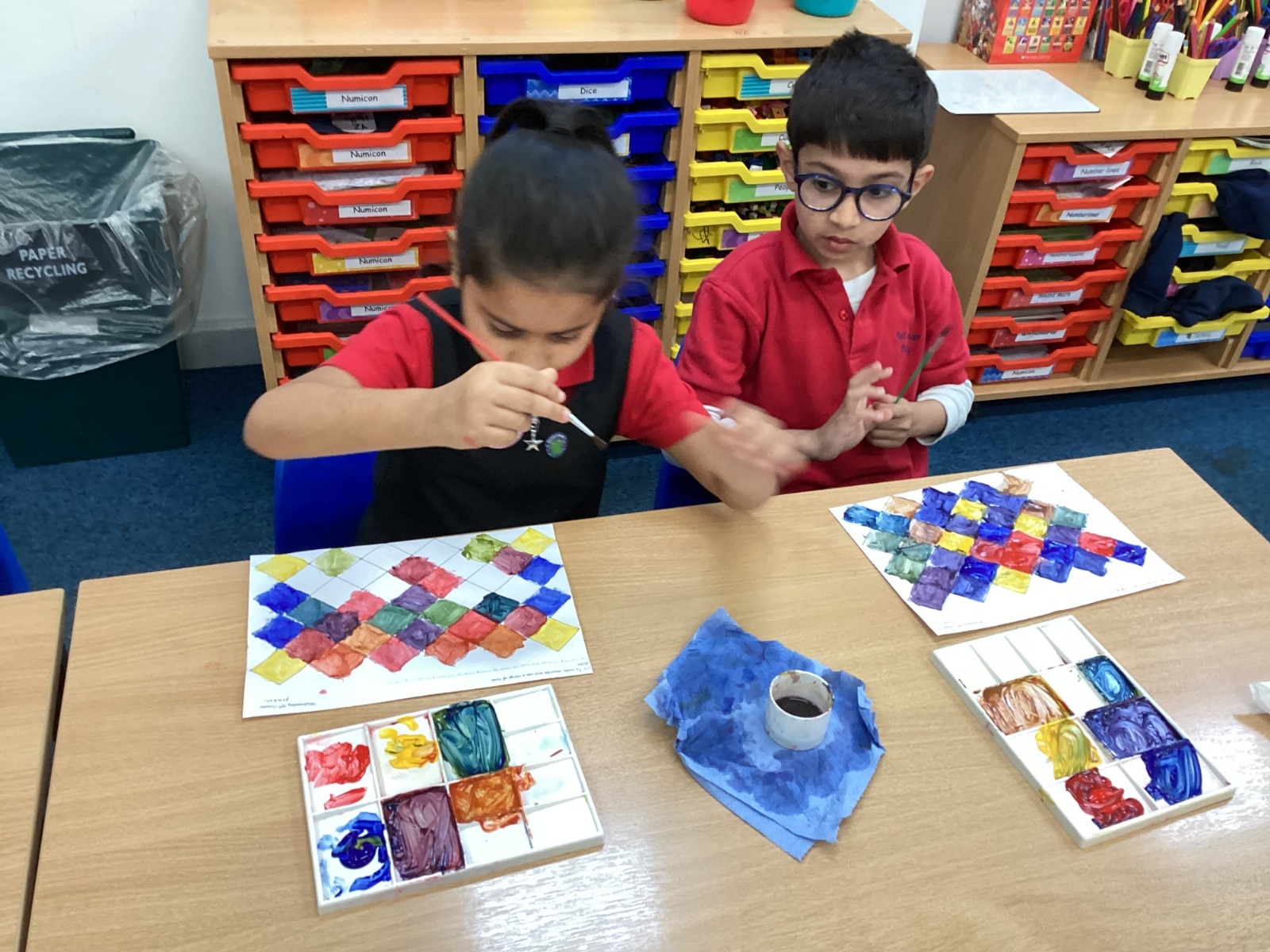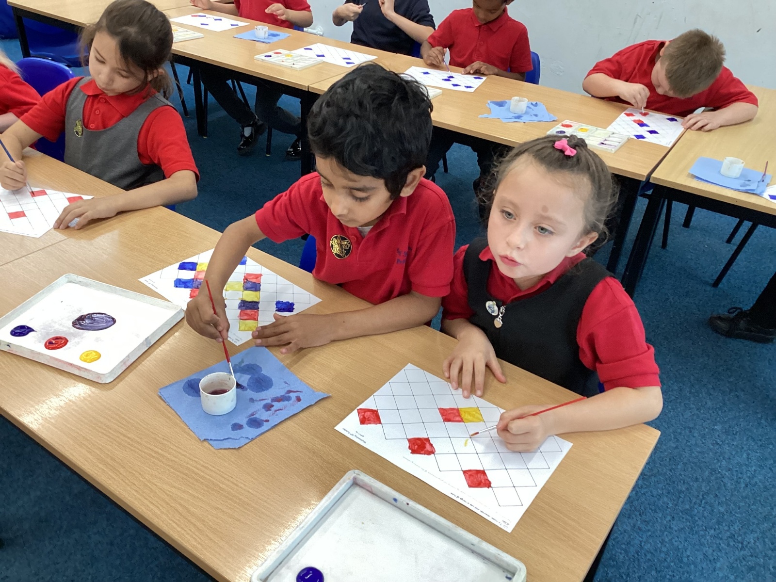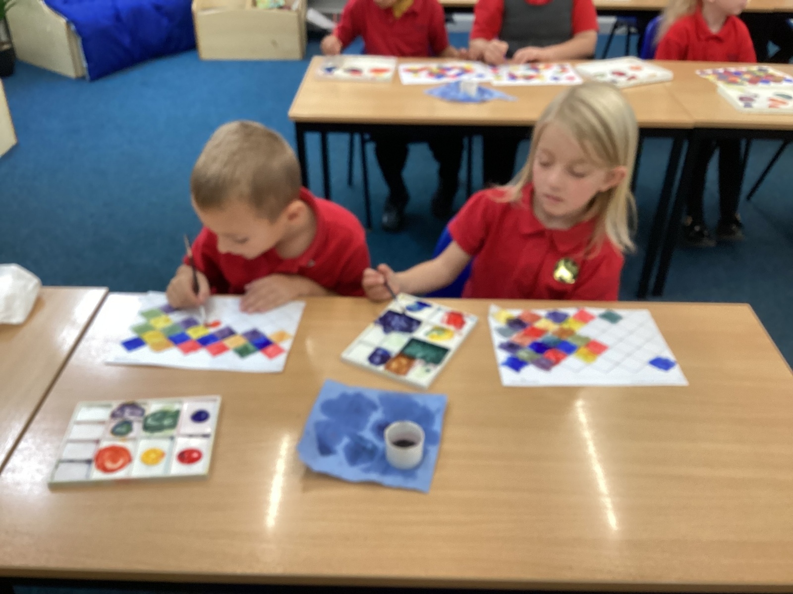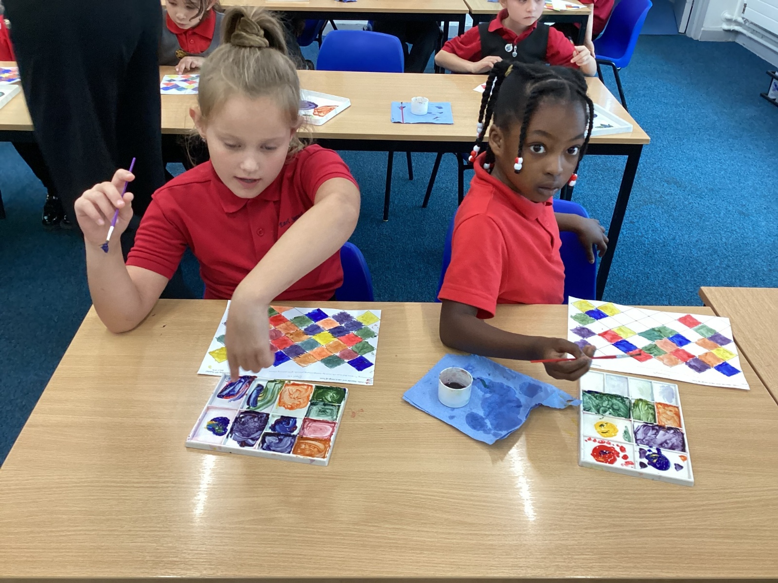 In Art and Design this week we made artwork using primary colours and secondary colours with a range of hues. Our challenge was not to let 2 sections with the same colour or hue touch each other.