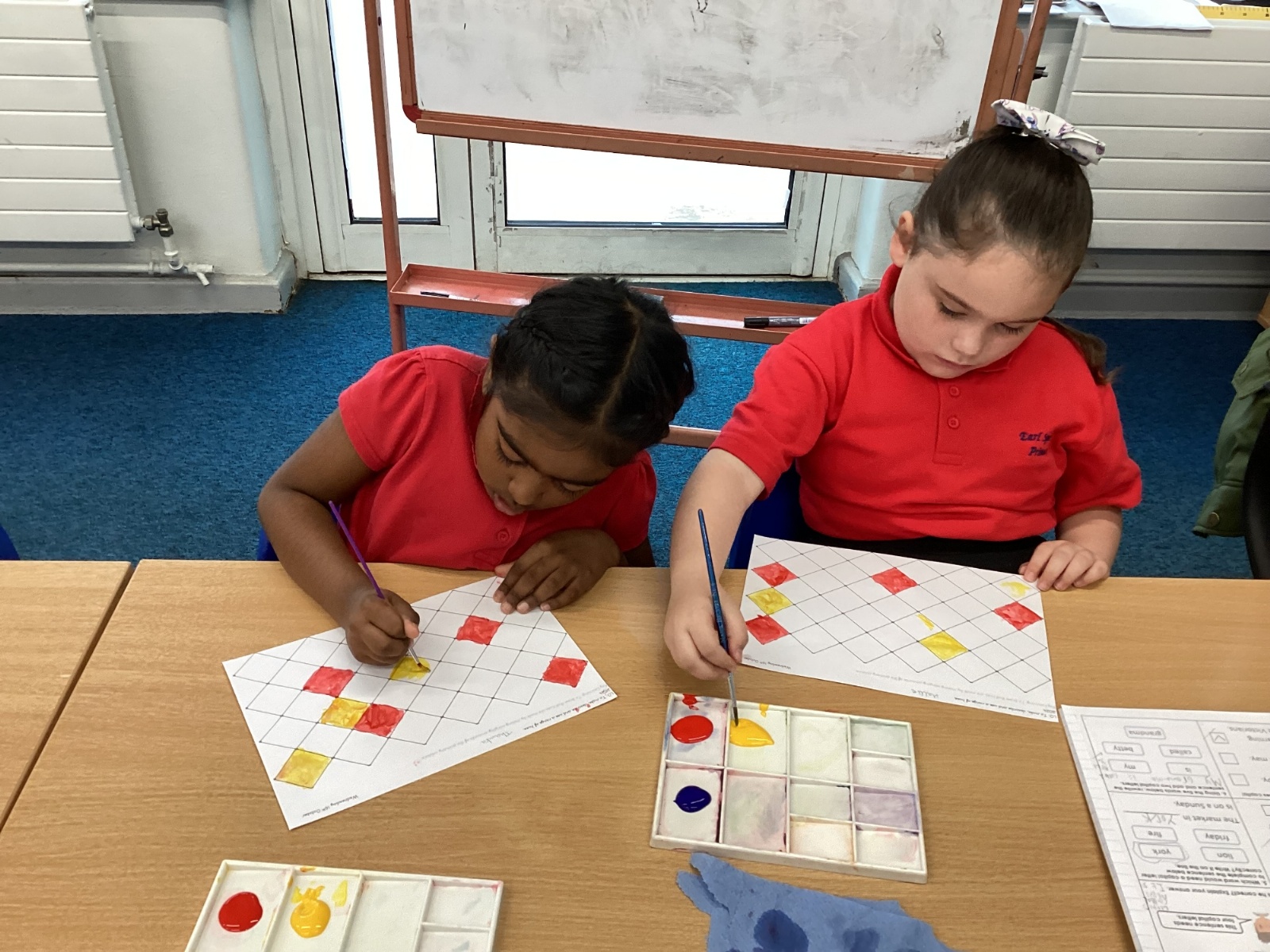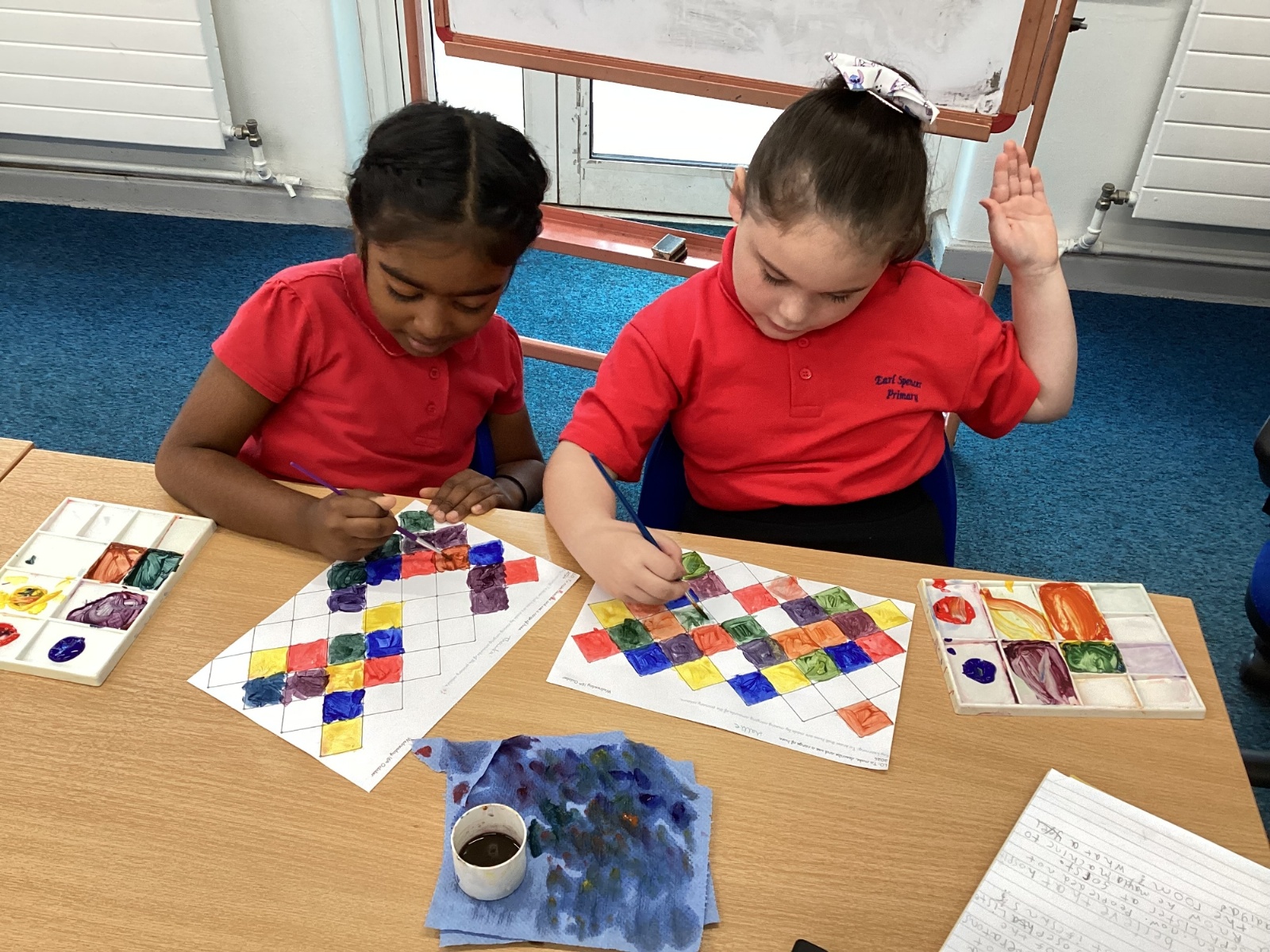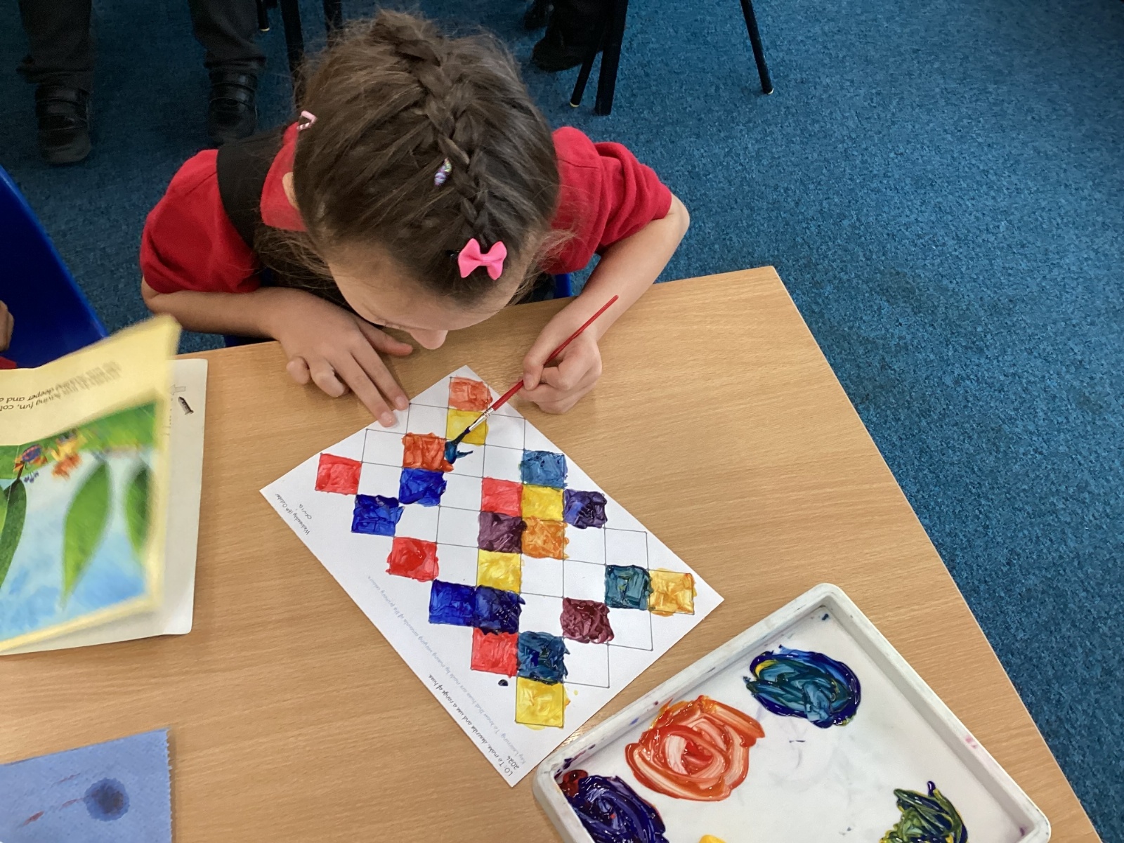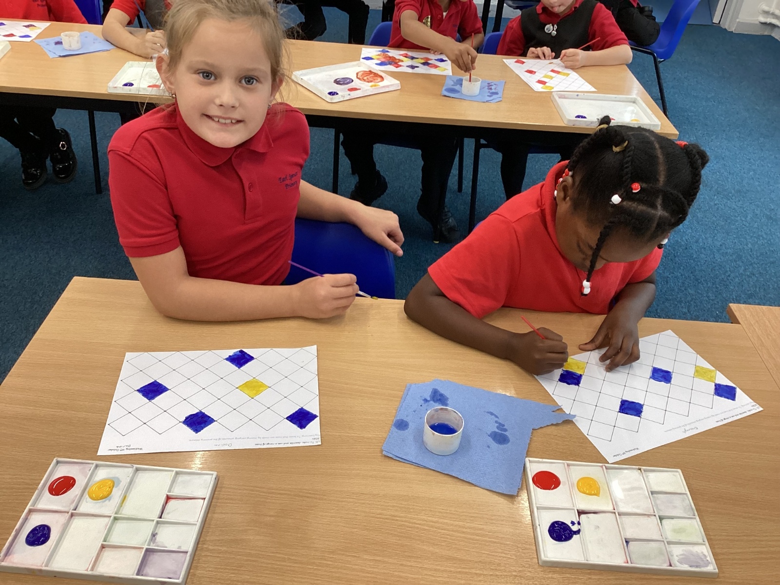 In Art and Design this week we made artwork using primary colours and secondary colours with a range of hues. Our challenge was not to let 2 sections with the same colour or hue touch each other.