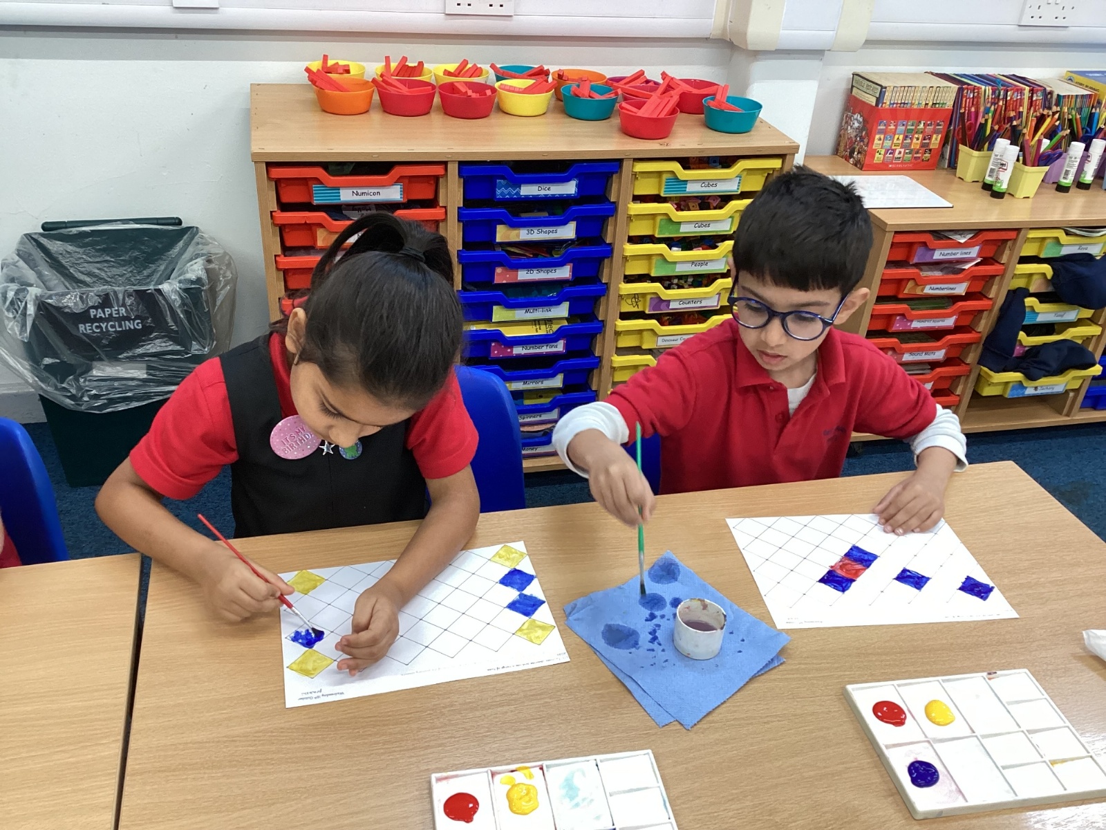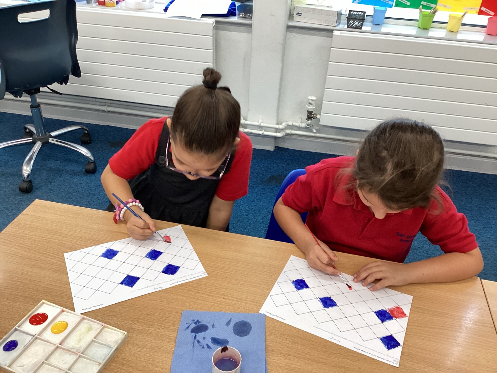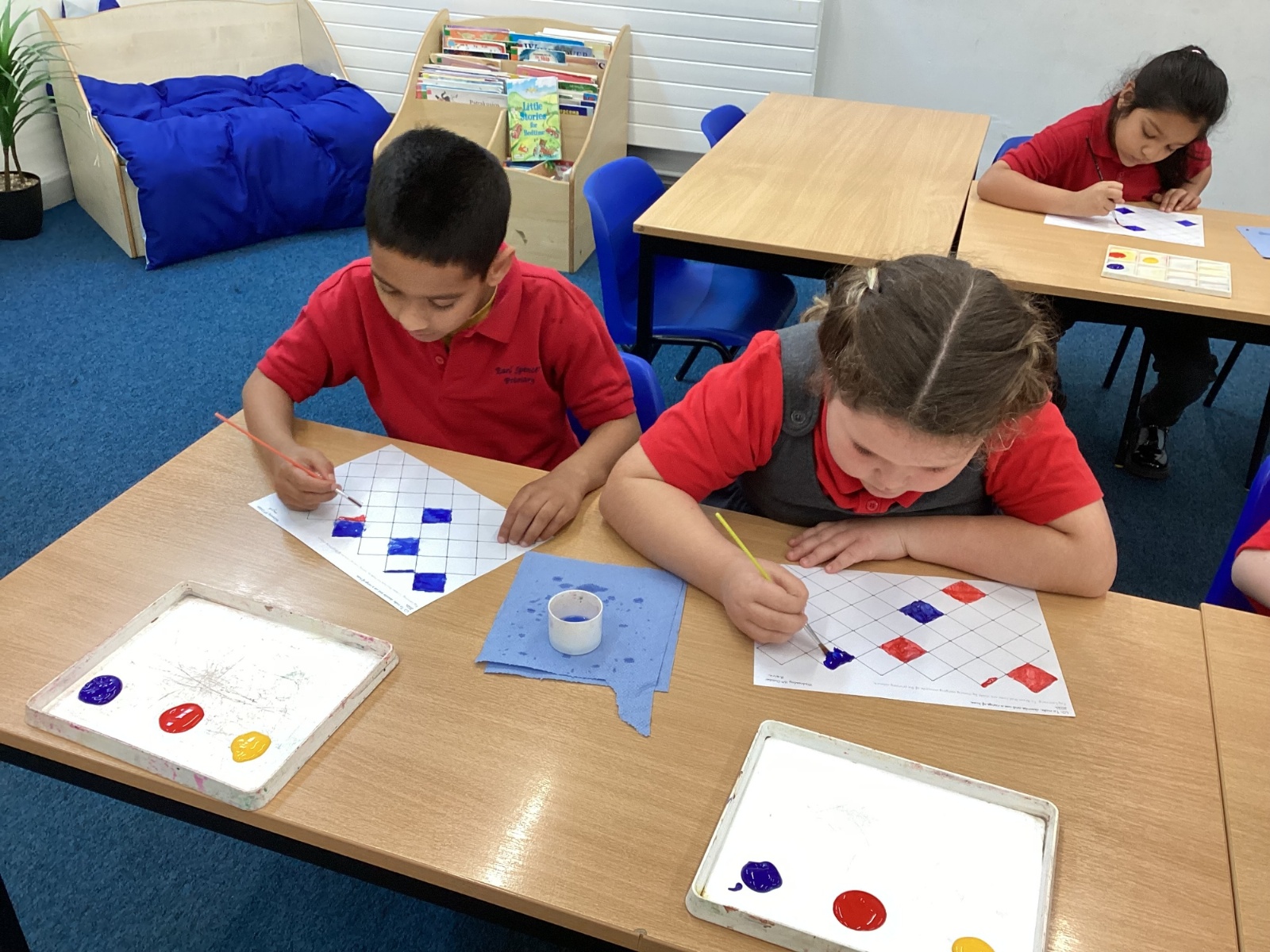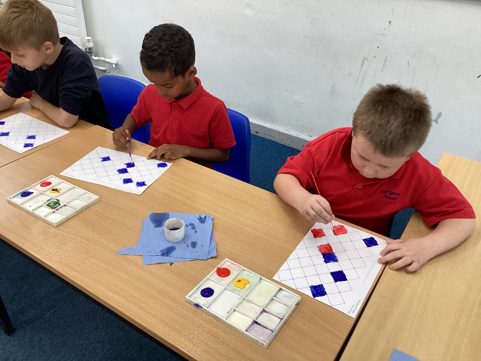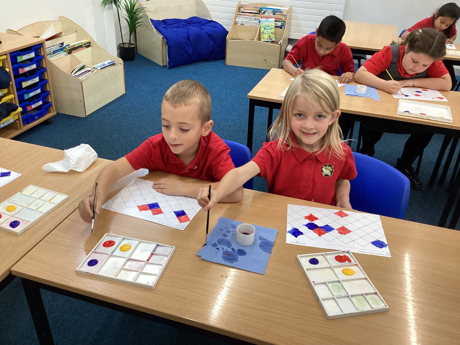 In Art and Design this week we made artwork using primary colours and secondary colours with a range of hues. Our challenge was not to let 2 sections with the same colour or hue touch each other.