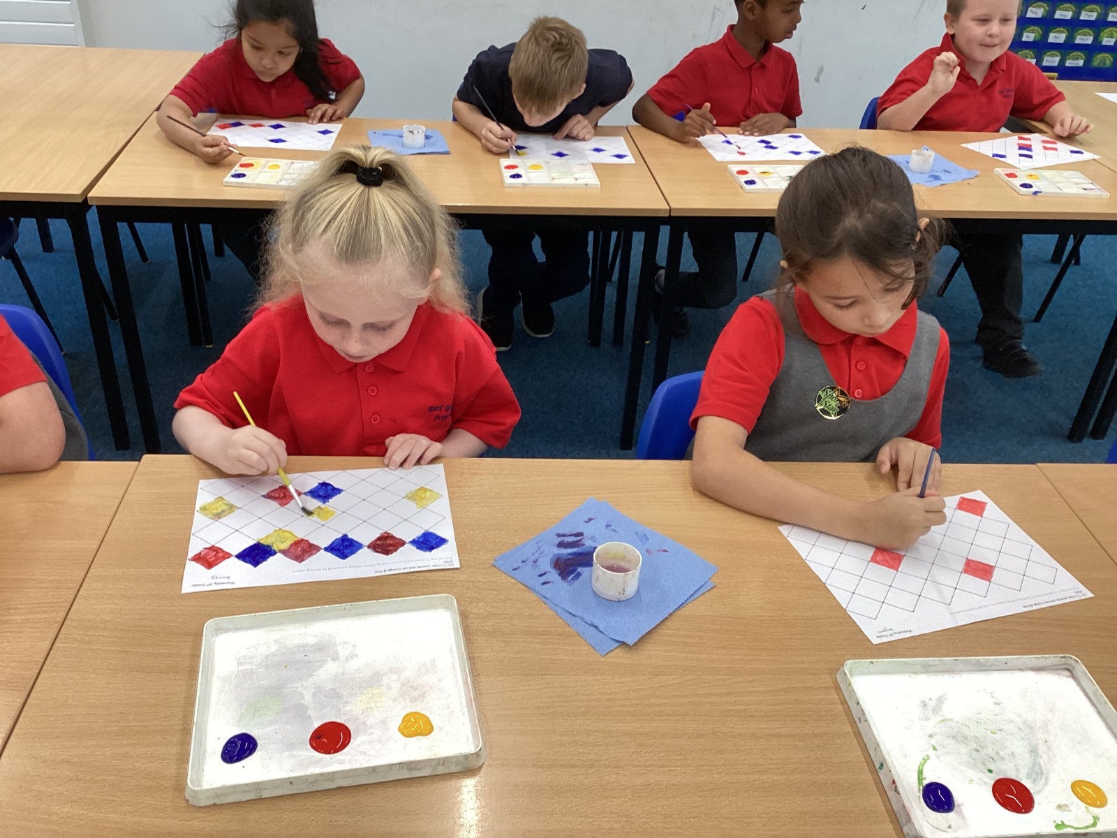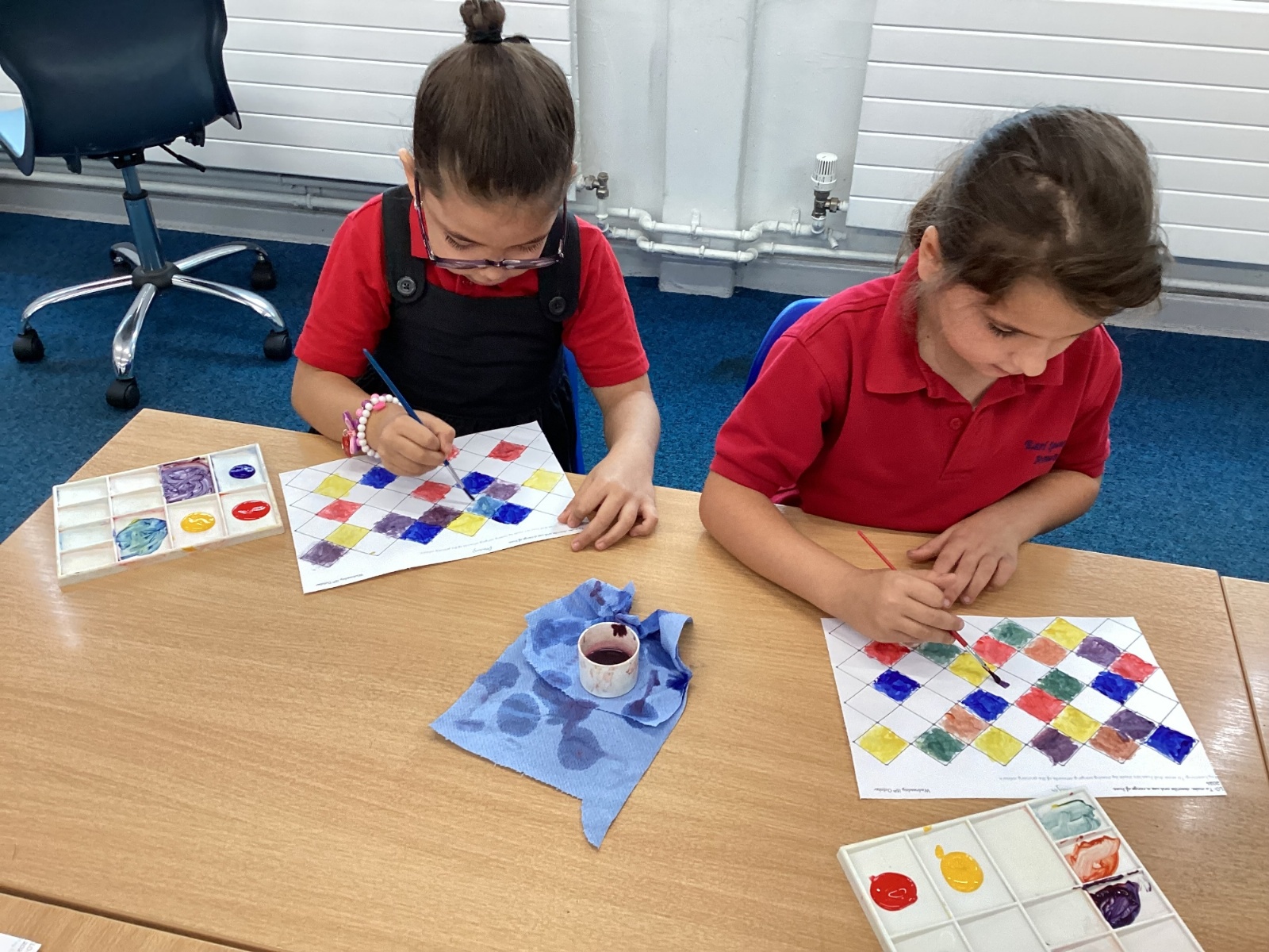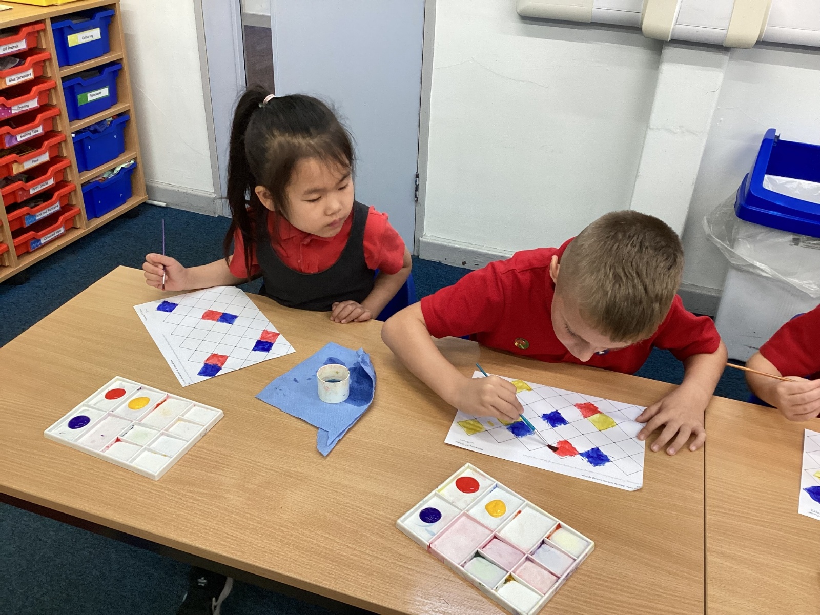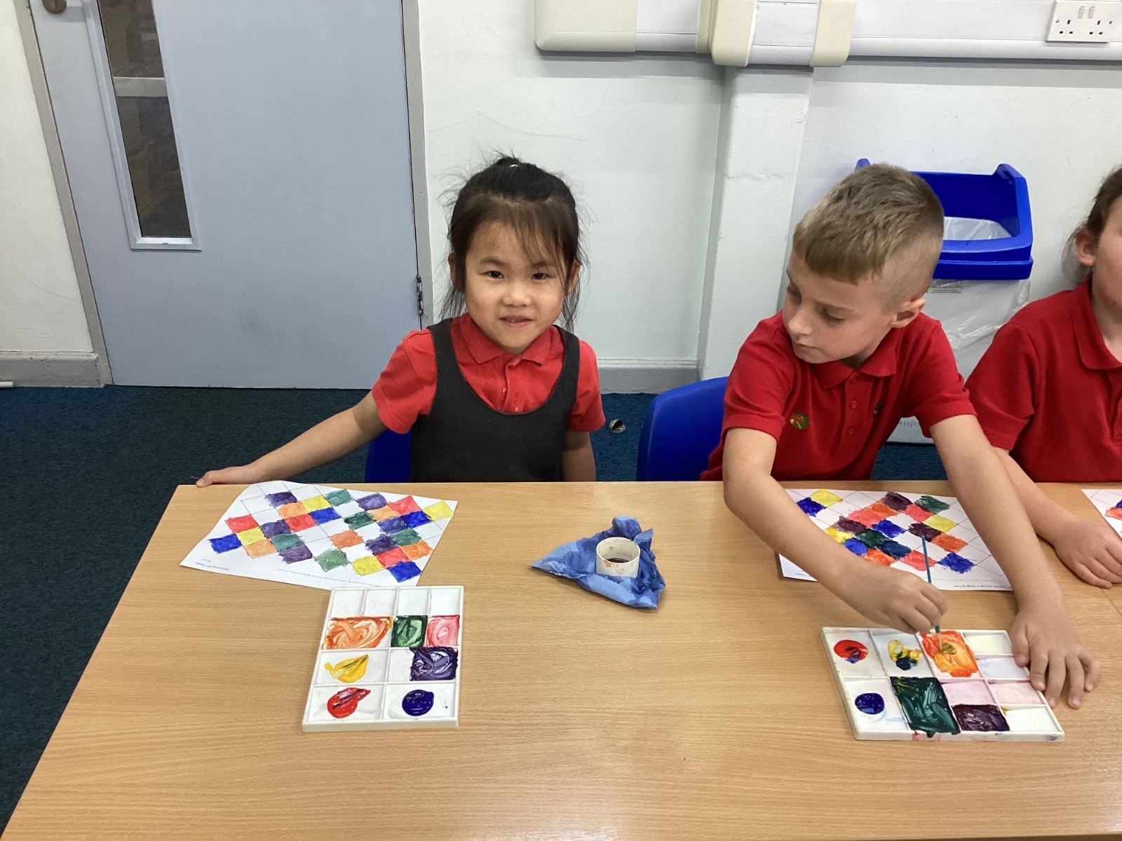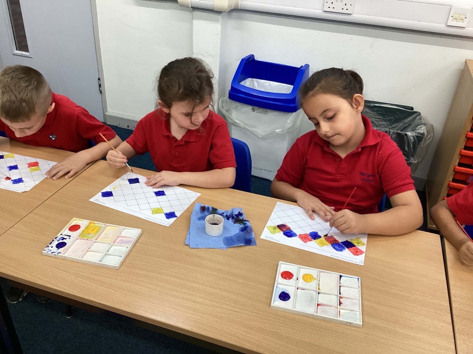 In Art and Design this week we made artwork using primary colours and secondary colours with a range of hues. Our challenge was not to let 2 sections with the same colour or hue touch each other.