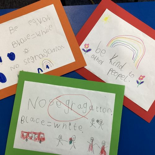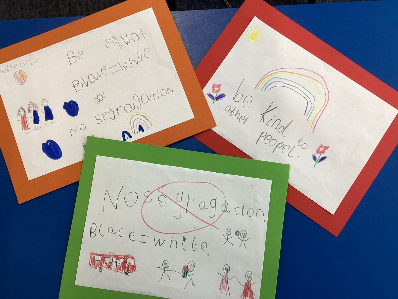 We have been learning about Rosa Parks and her impact on standing up for black people. We learnt that she no longer thought it was right that black people had to give up their seats on buses for white people and she fought for this to be changed. We then made placards about equal rights and went on a march around the playground.