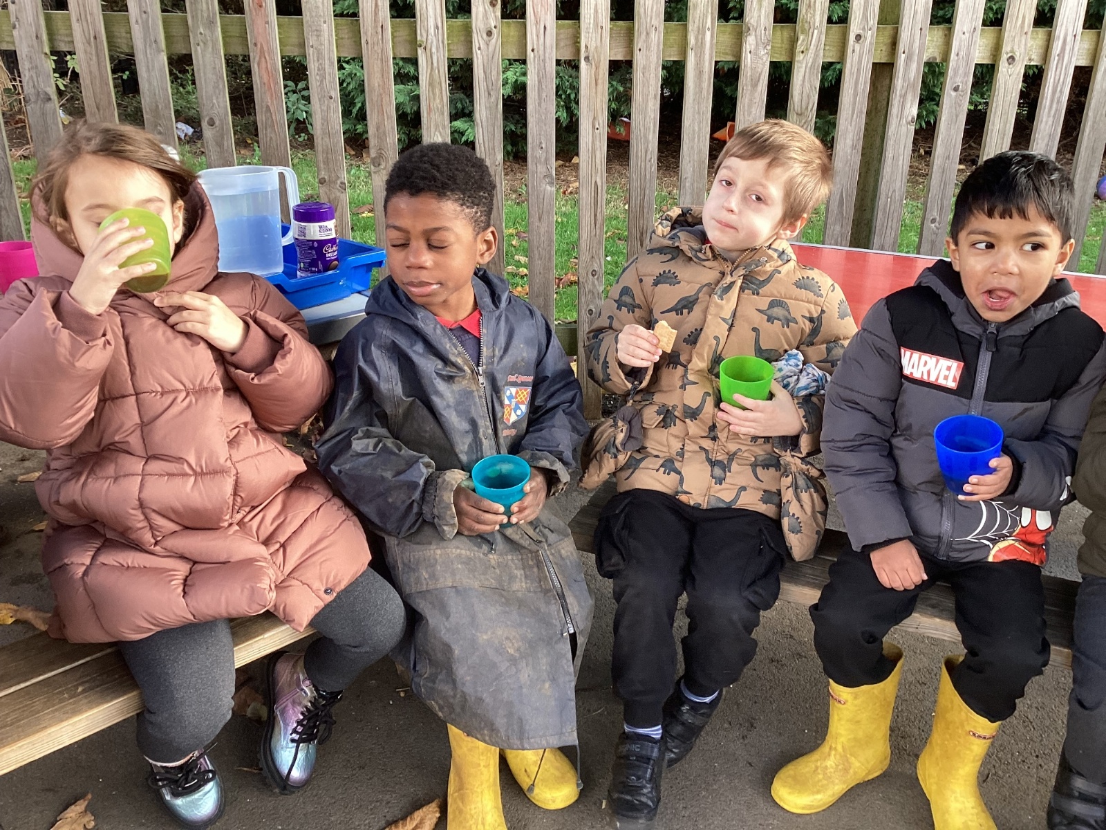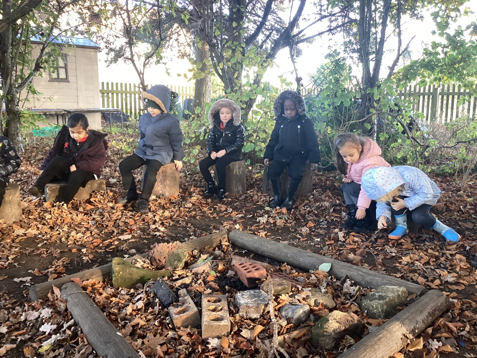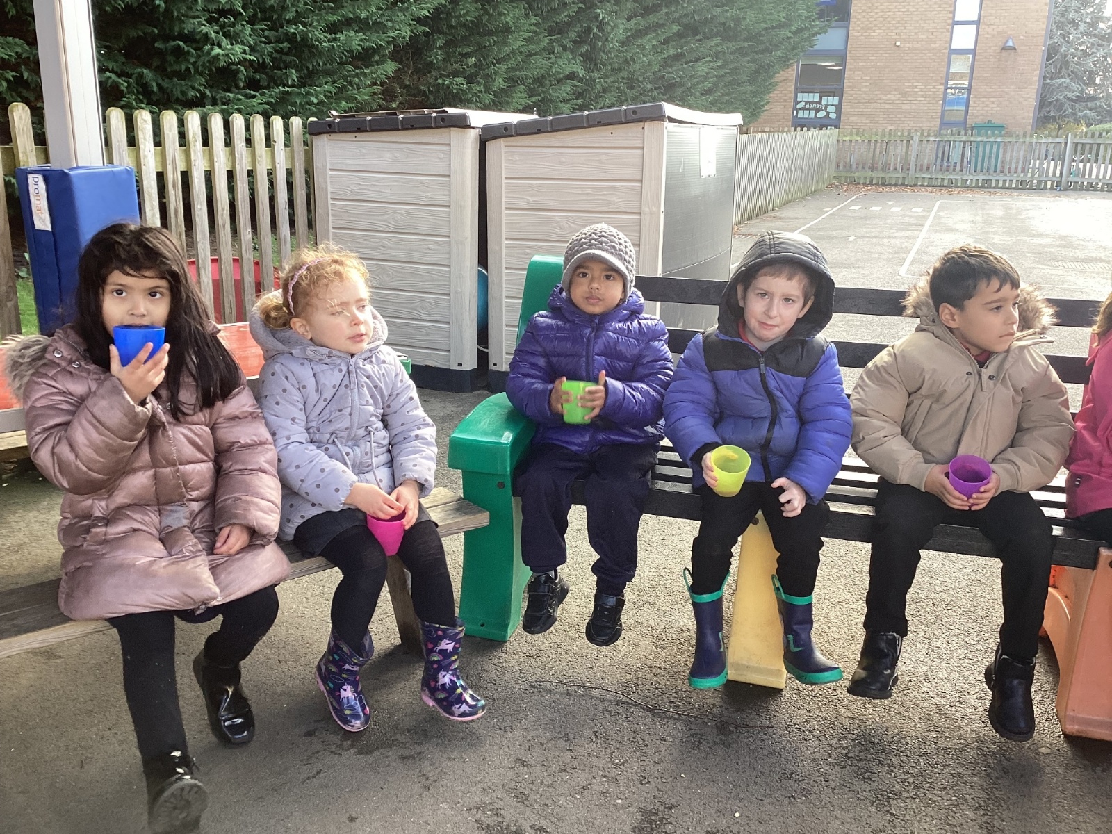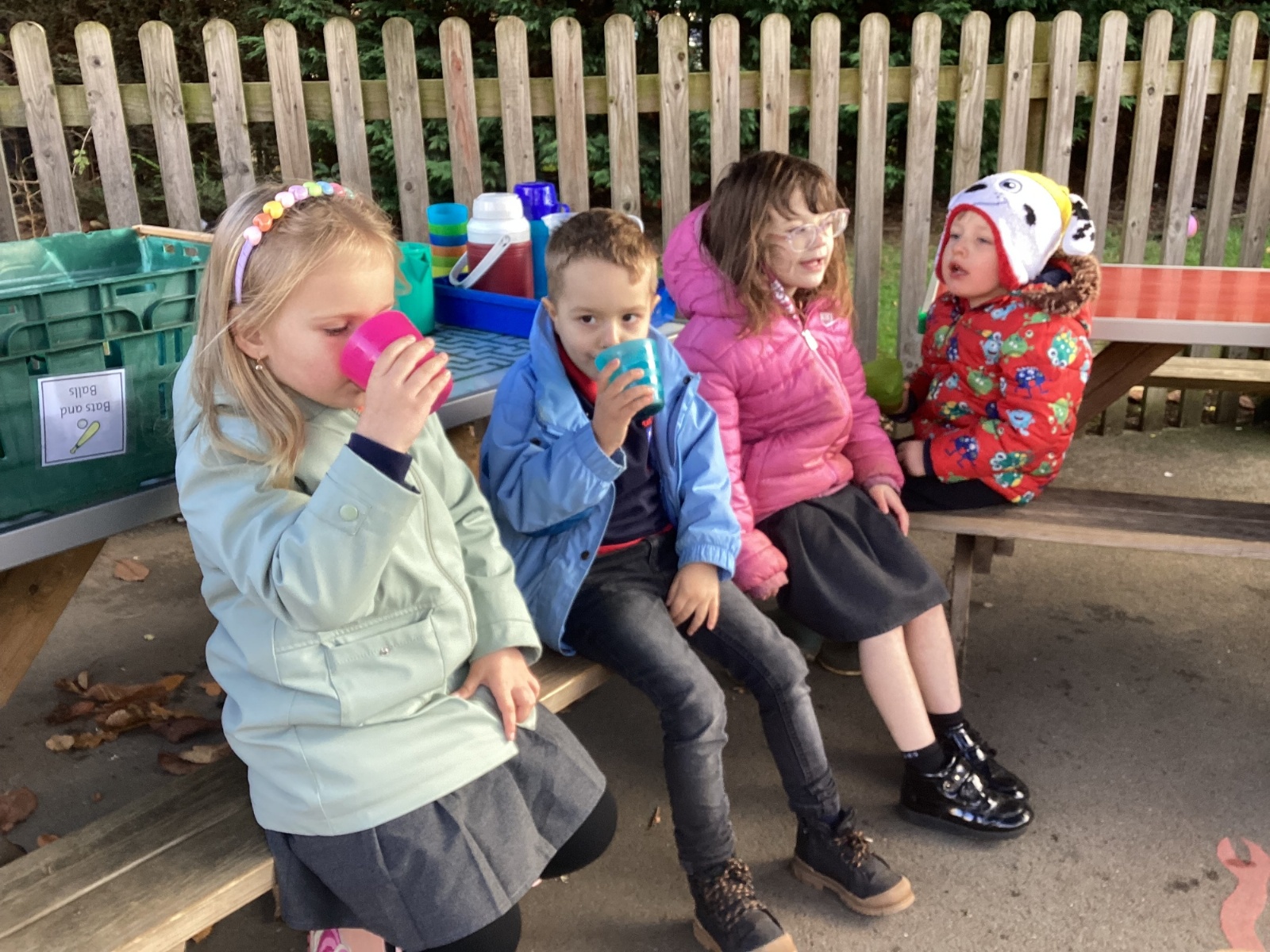 We had a lovely time exploring the outside area. We enjoyed using the forest school area and going on a nature walk. We even sat down with our friends for a hot chocolate and biscuit whilst listening to a story.