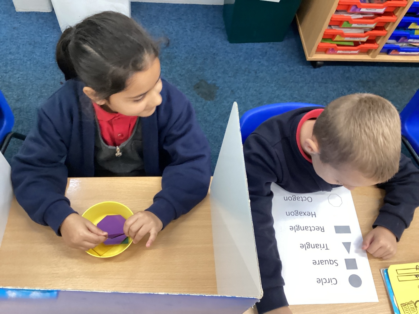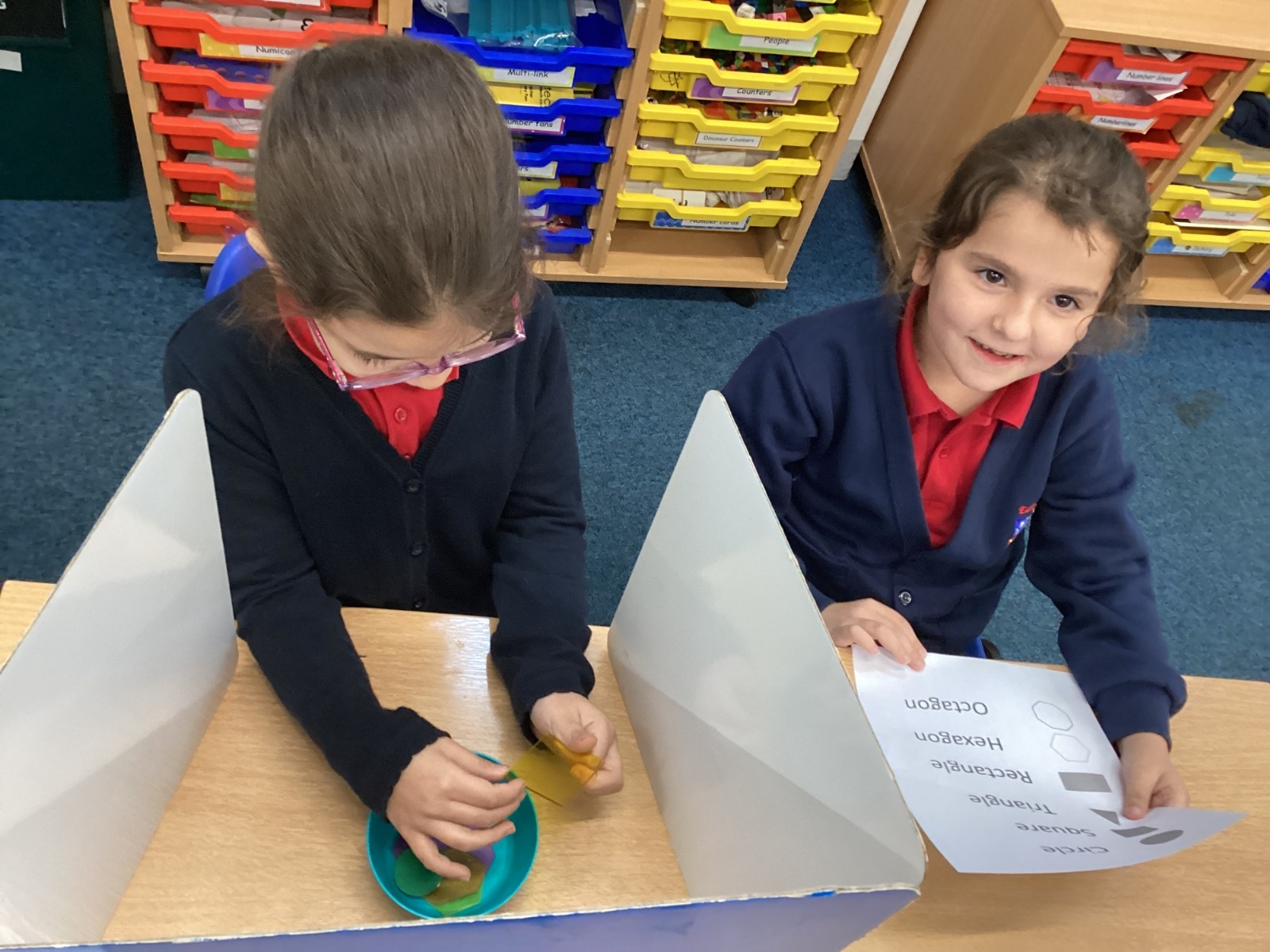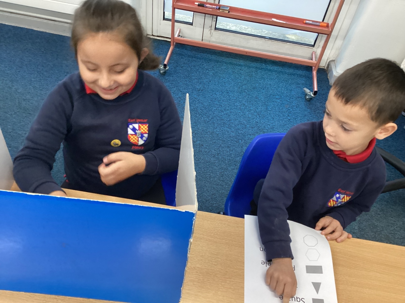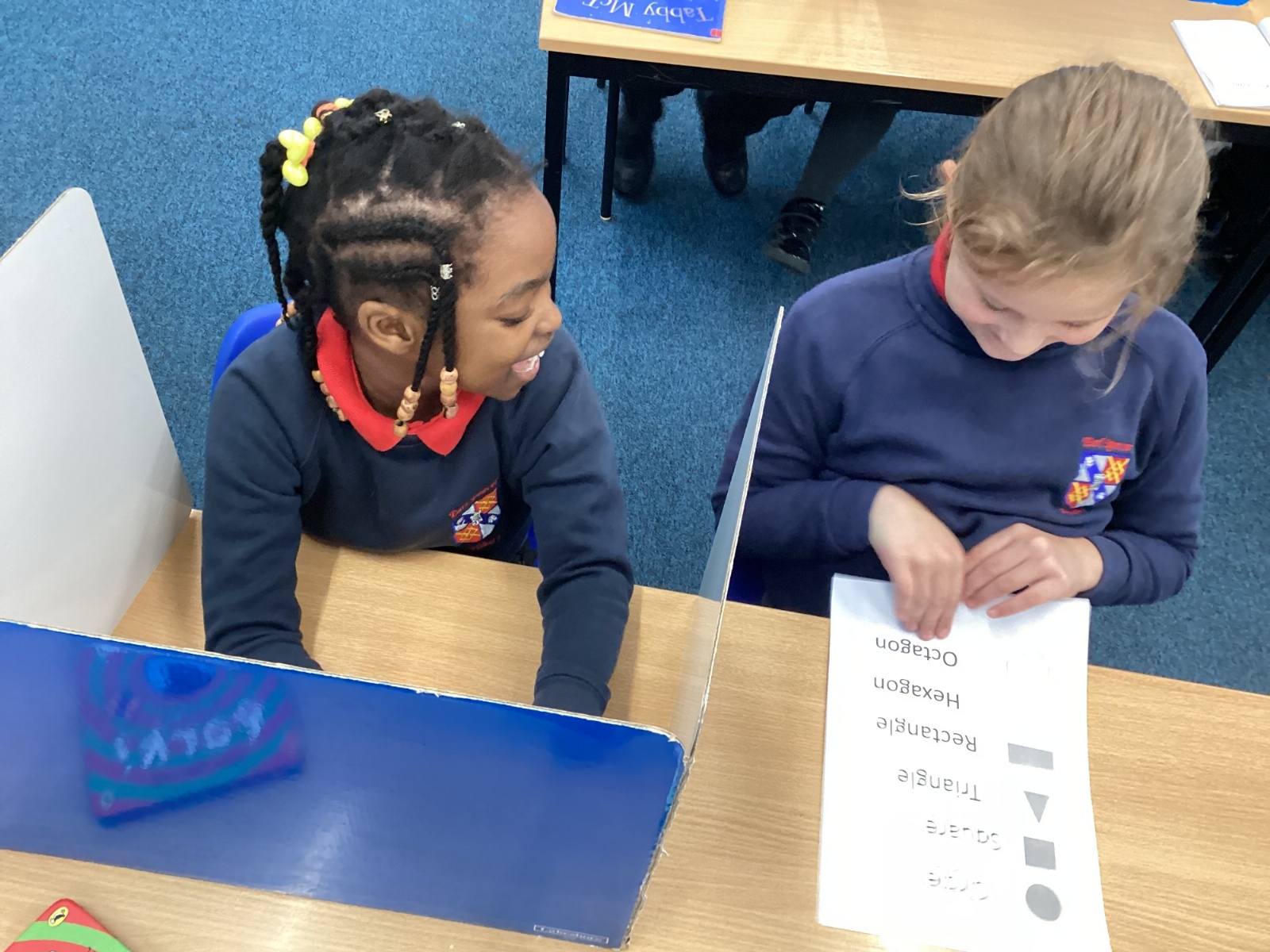 In Maths this week we have been learning about shape. Today we played the barrier game -one of us had to describe the properties of a 2D shape using the appropriate vocabulary, and the other one had to guess the shape they were describing!