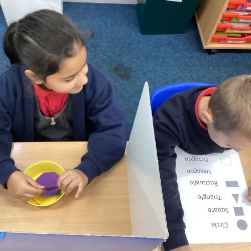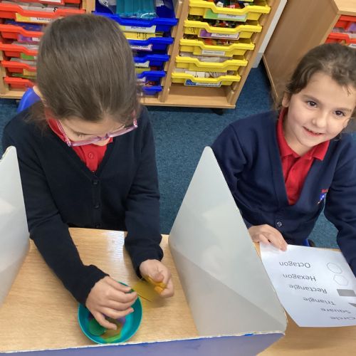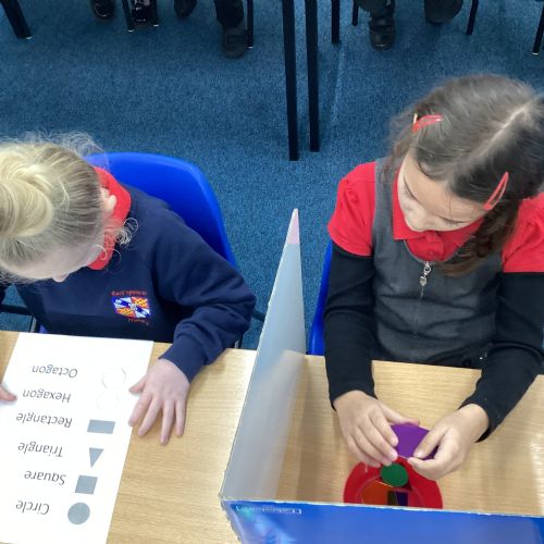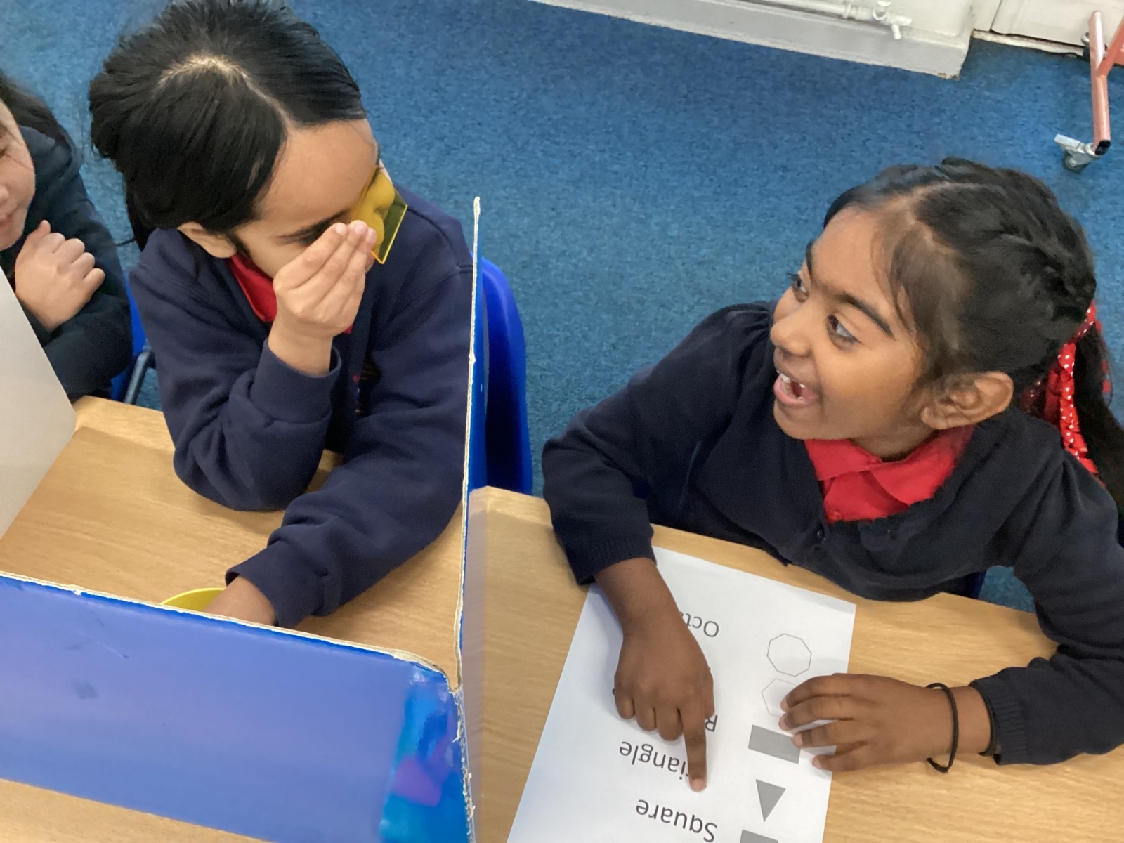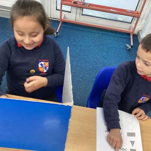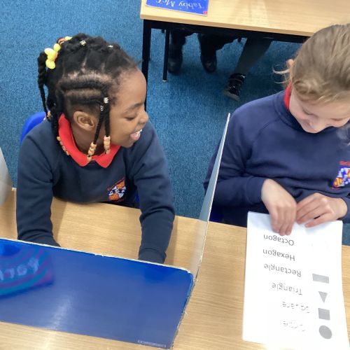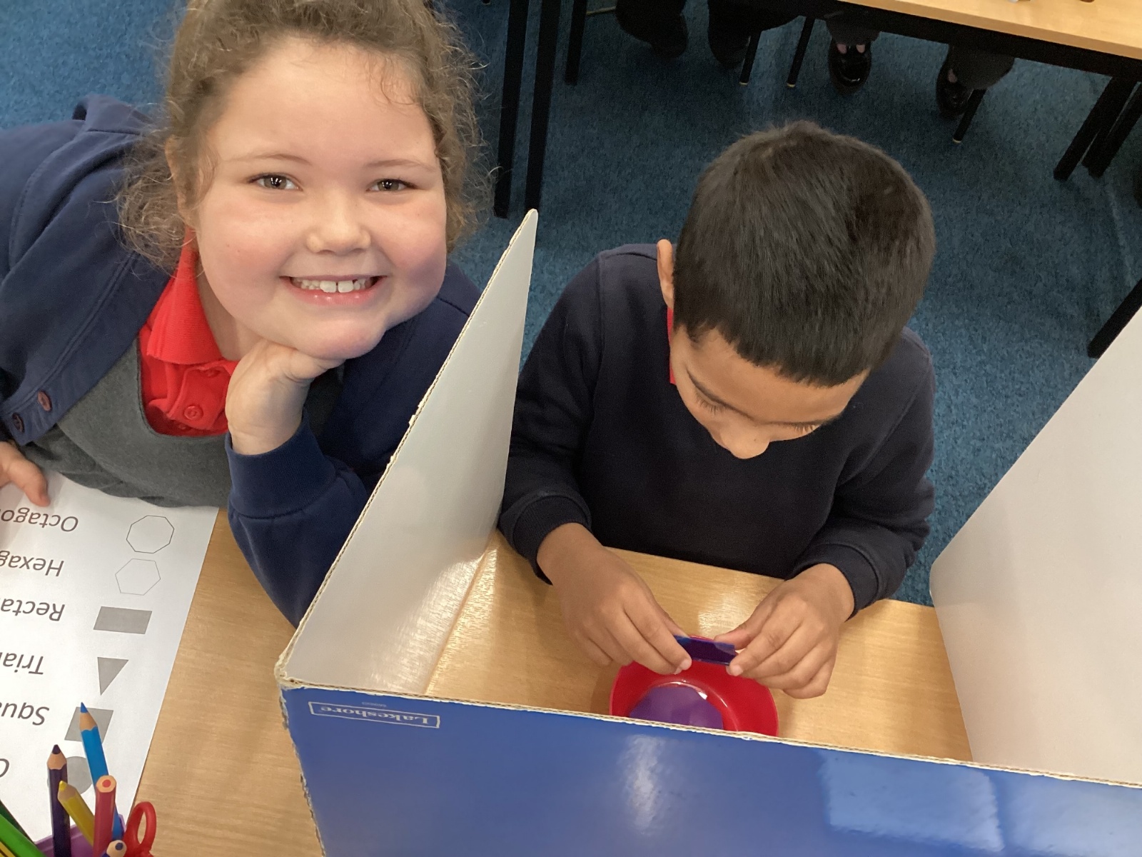 In Maths this week we have been learning about shape. Today we played the barrier game -one of us had to describe the properties of a 2D shape using the appropriate vocabulary, and the other one had to guess the shape they were describing!