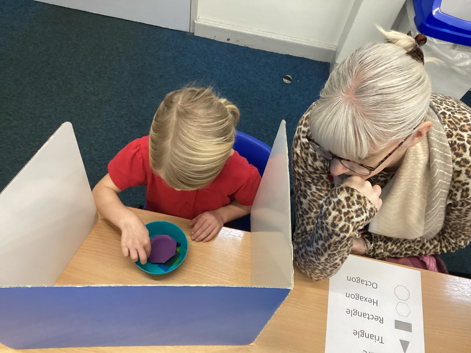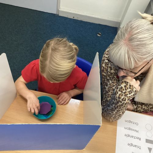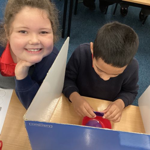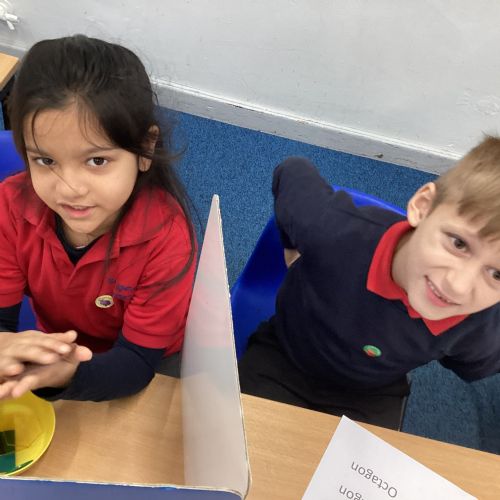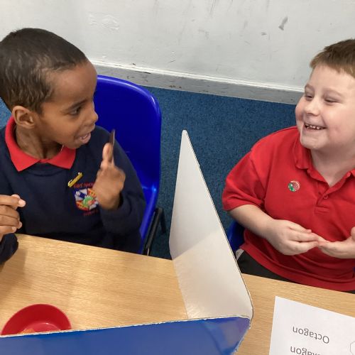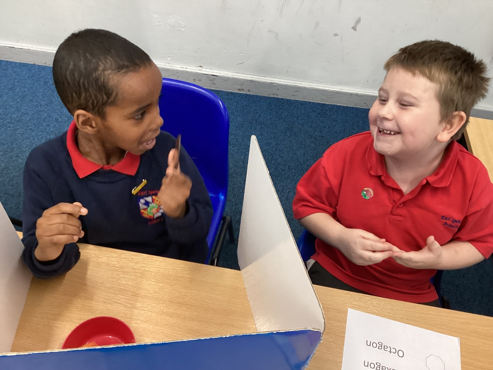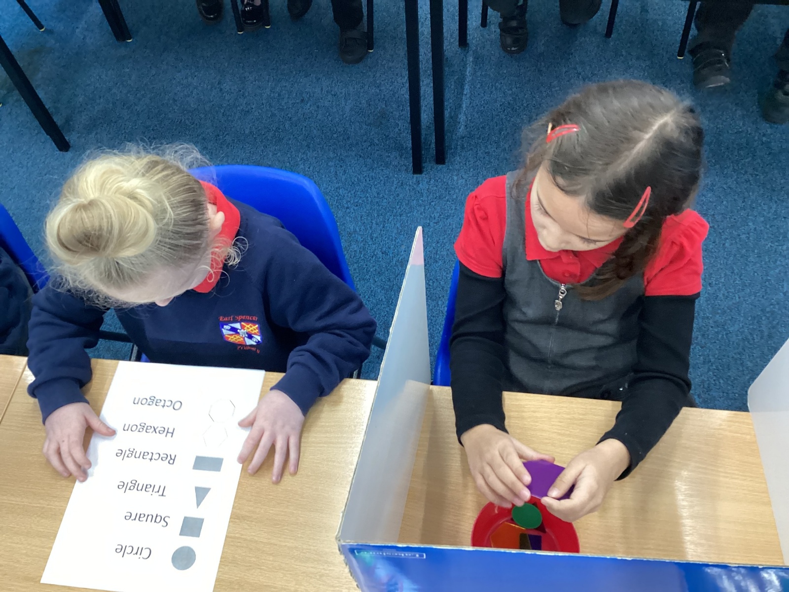 In Maths this week we have been learning about shape. Today we played the barrier game -one of us had to describe the properties of a 2D shape using the appropriate vocabulary, and the other one had to guess the shape they were describing!