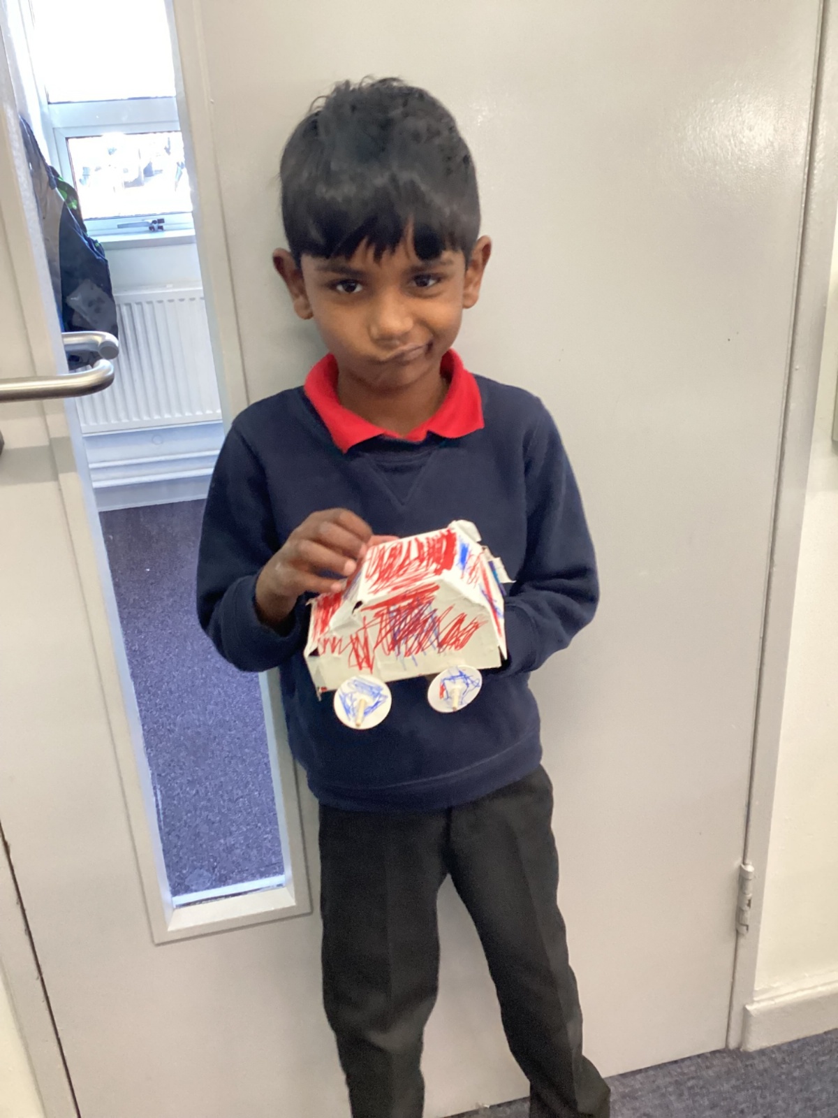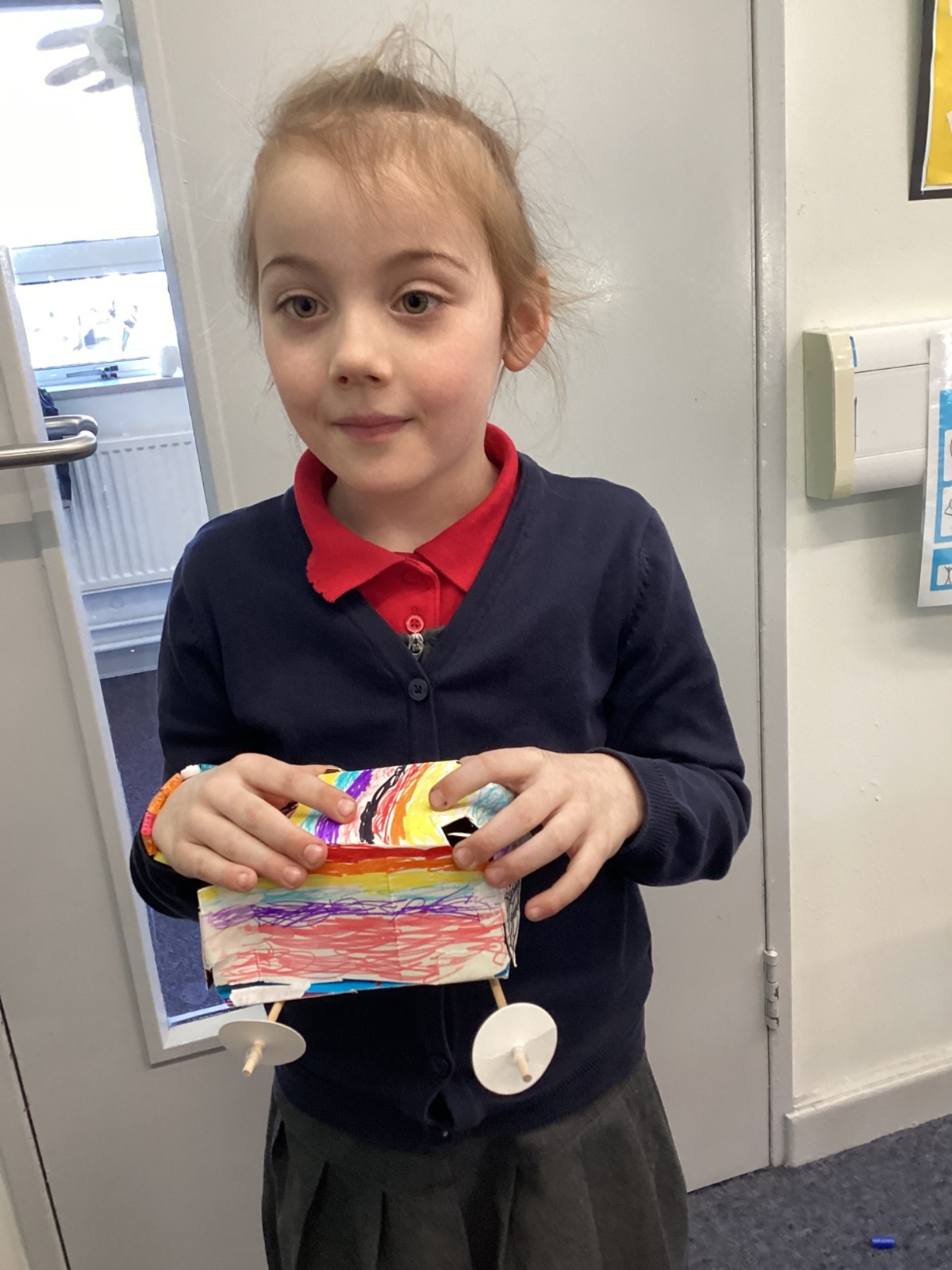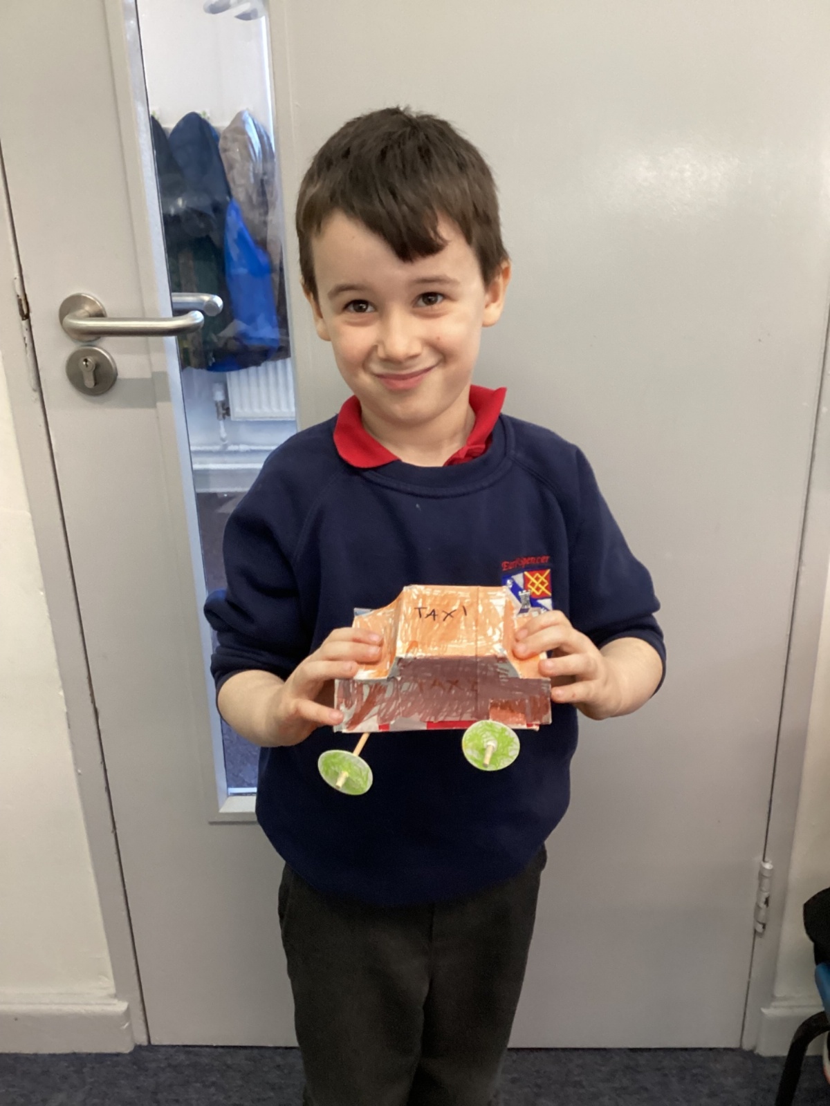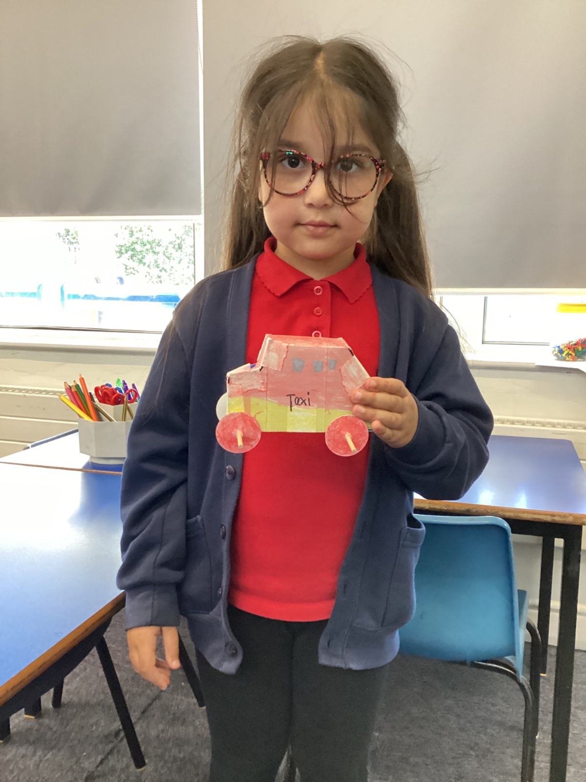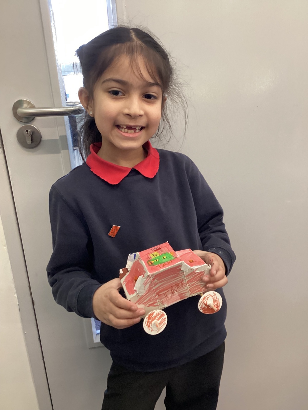 In our design technology lessons we have been looking at taxis and the different parts, wheels, chassis and axels. We then designed our own taxi before making it and decorating it to make sure it matched our design. Here you will see us with our finished taxi.