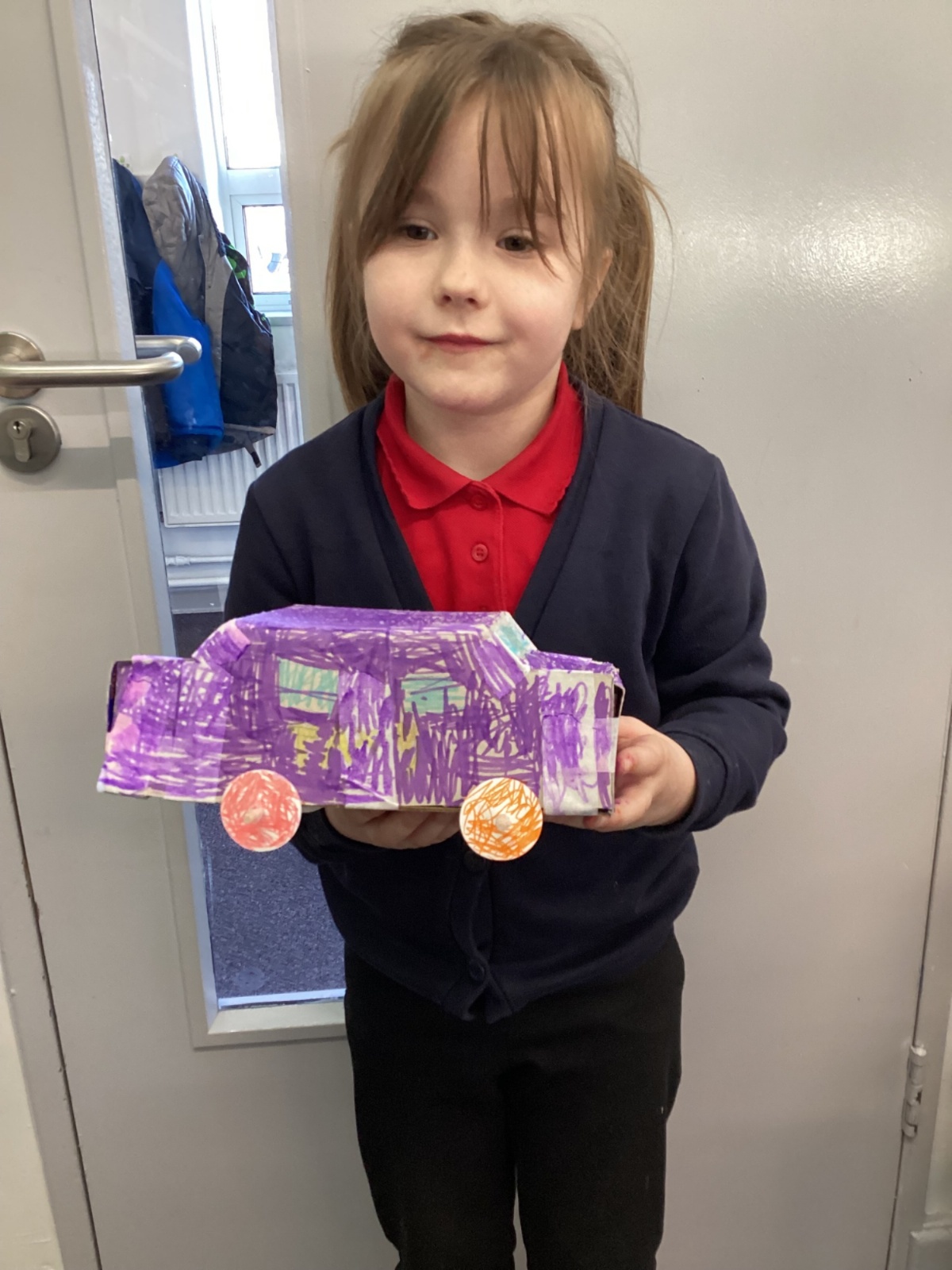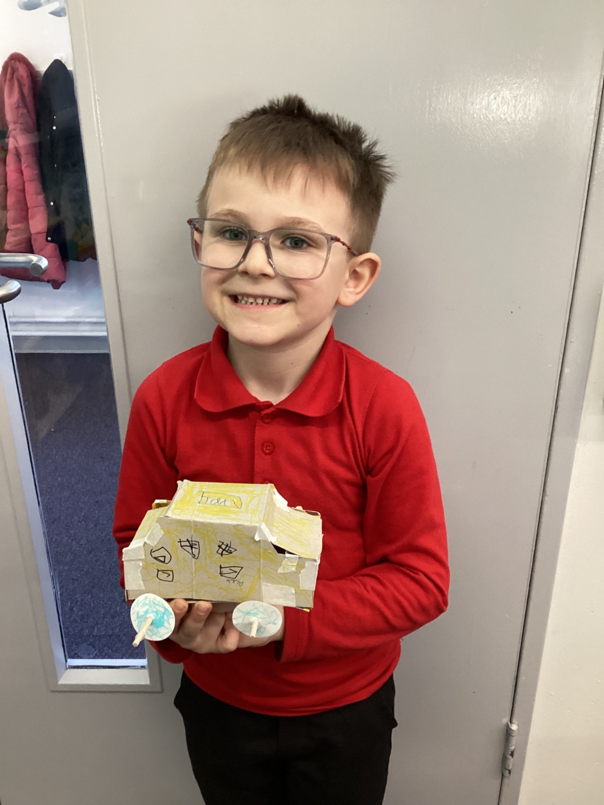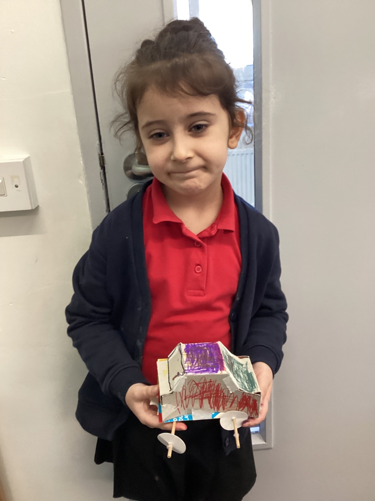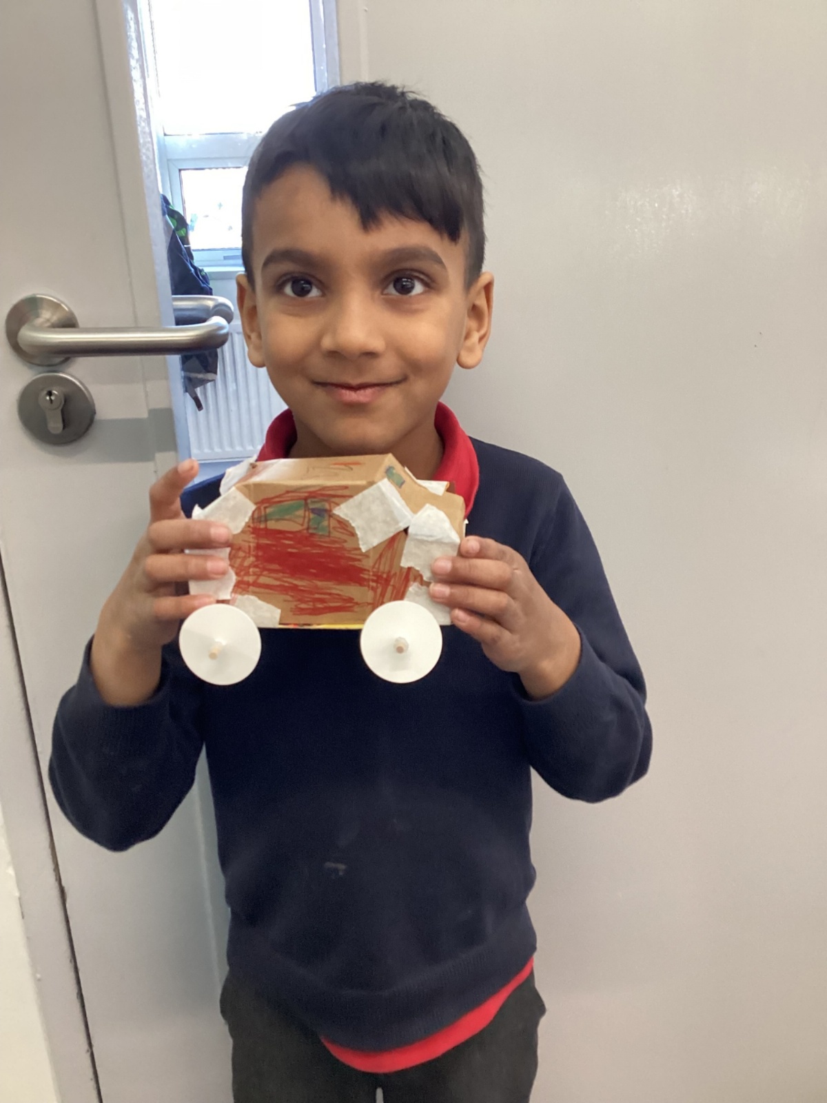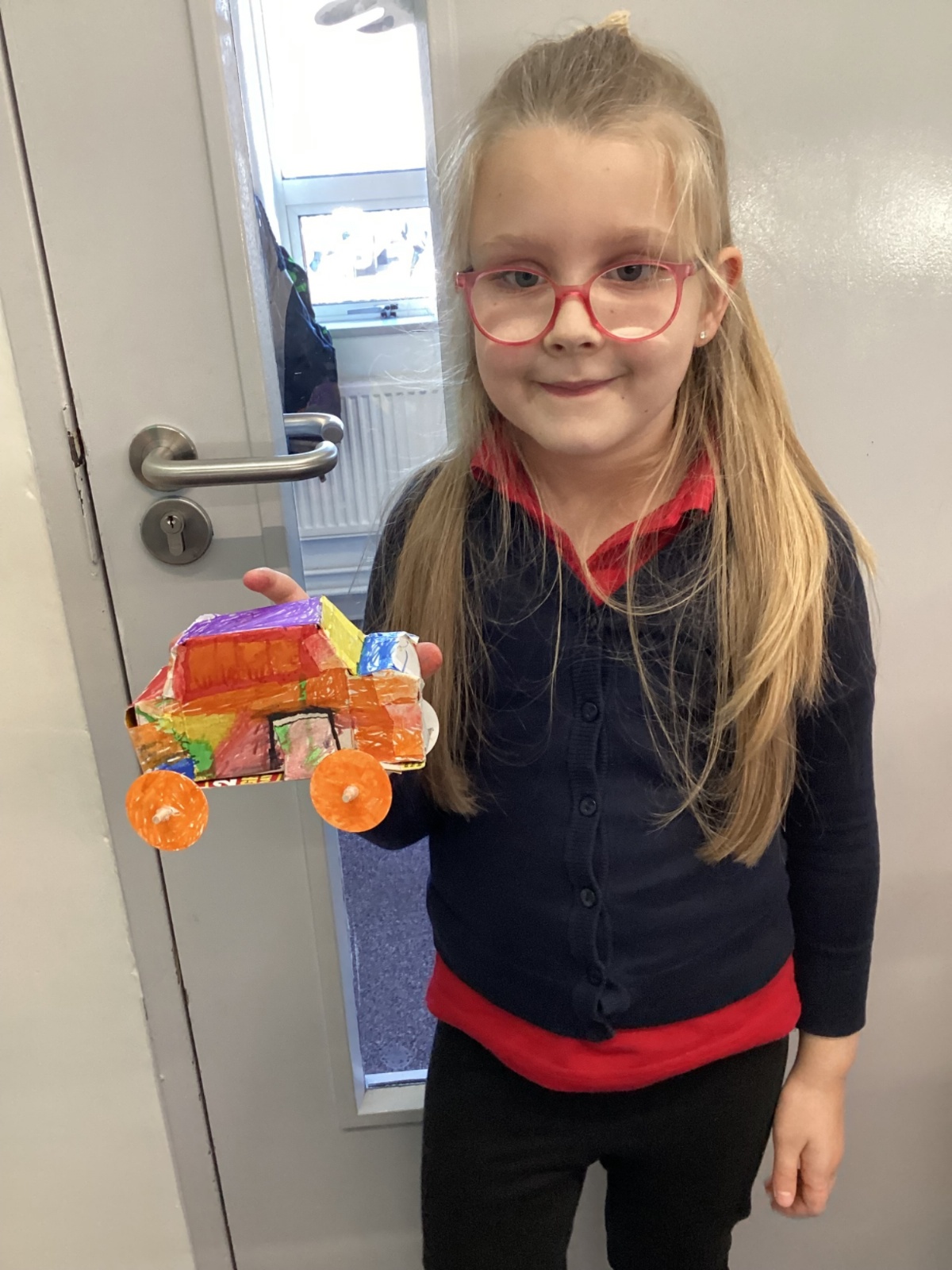 In our design technology lessons we have been looking at taxis and the different parts, wheels, chassis and axels. We then designed our own taxi before making it and decorating it to make sure it matched our design. Here you will see us with our finished taxi.