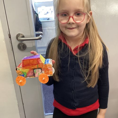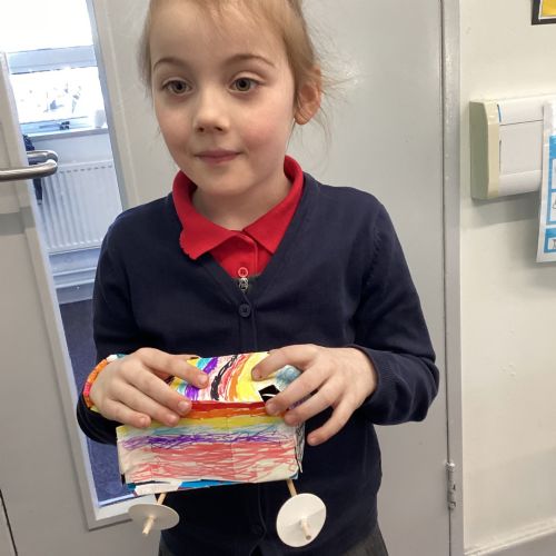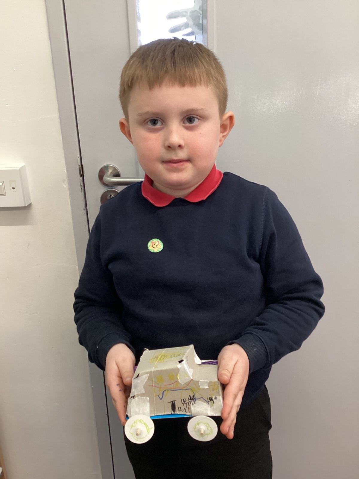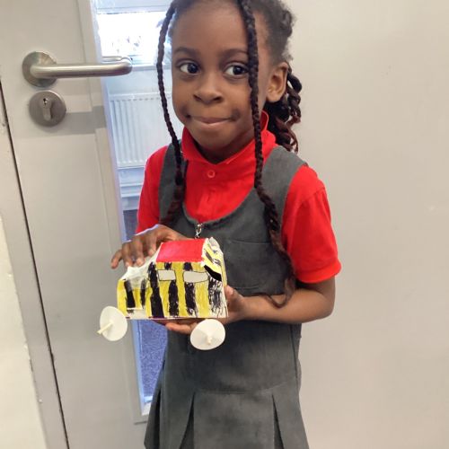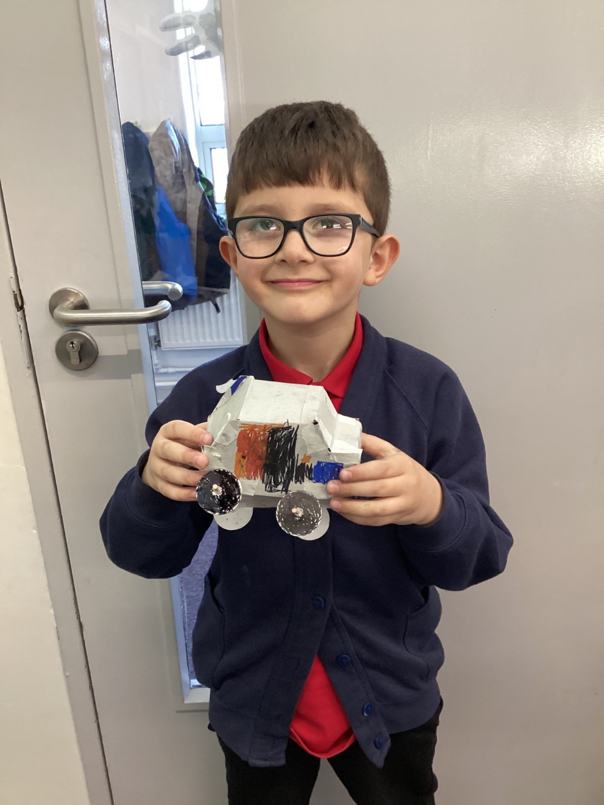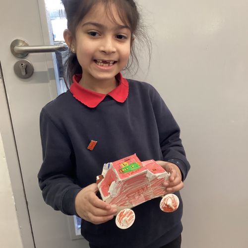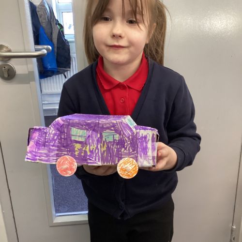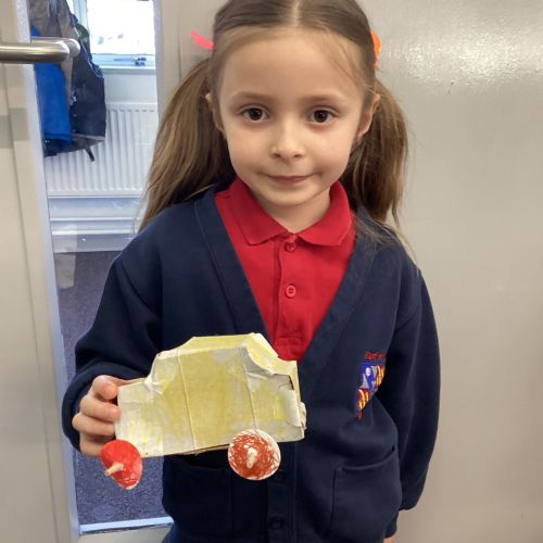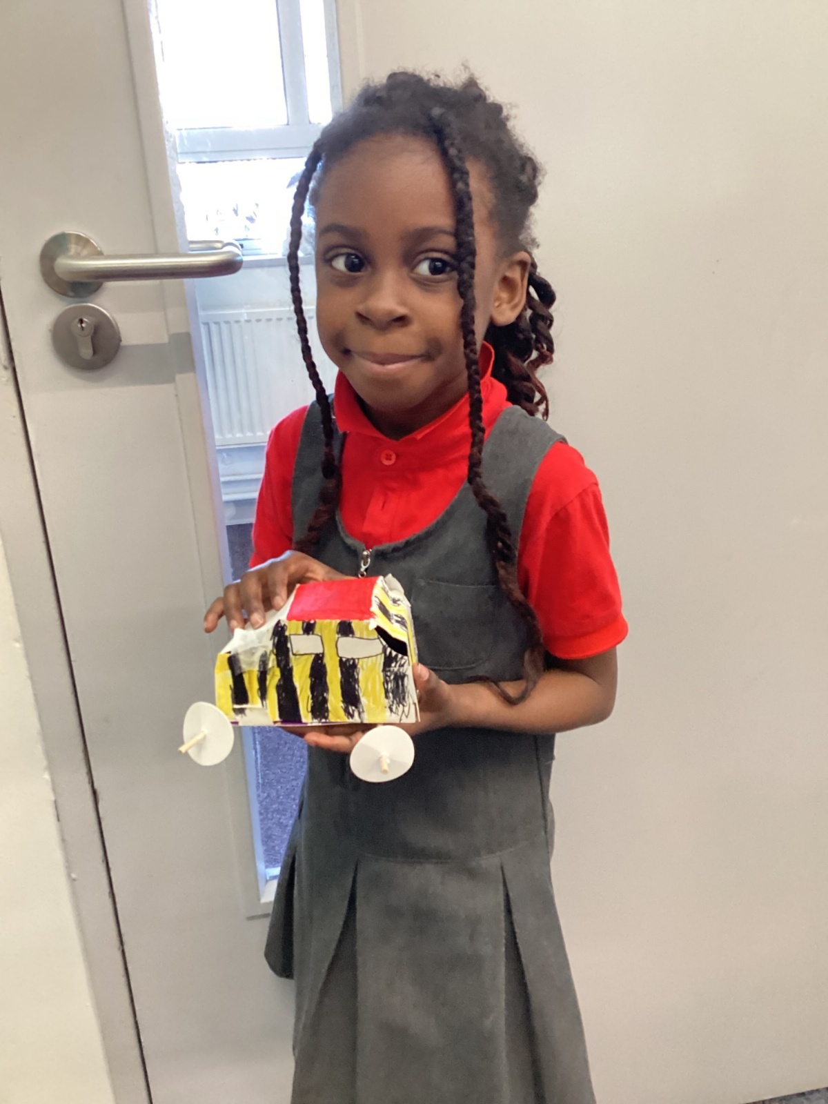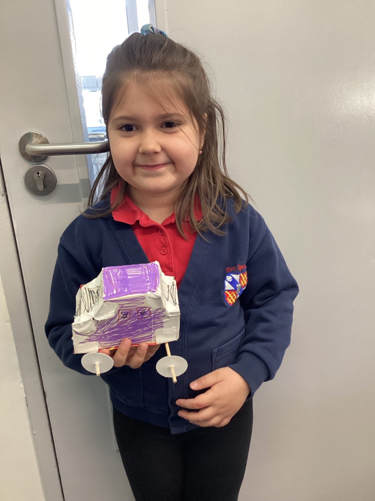 In our design technology lessons we have been looking at taxis and the different parts, wheels, chassis and axels. We then designed our own taxi before making it and decorating it to make sure it matched our design. Here you will see us with our finished taxi.