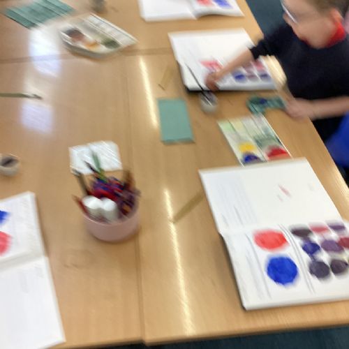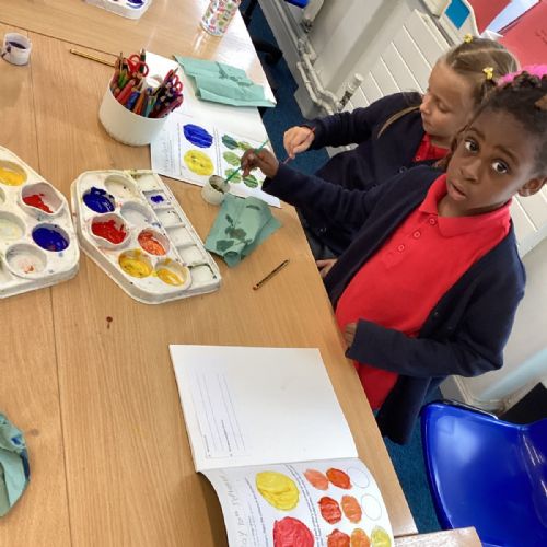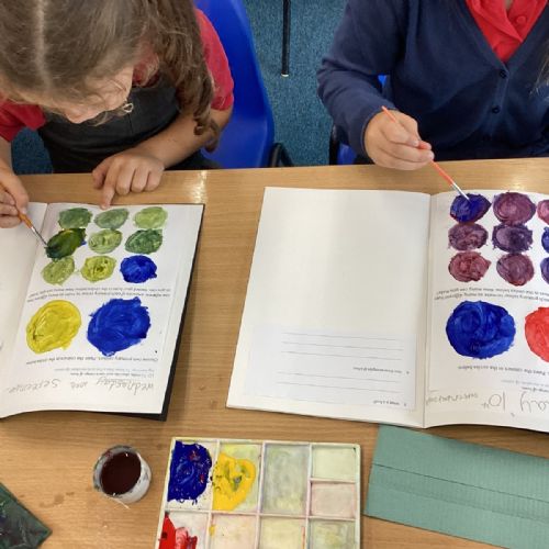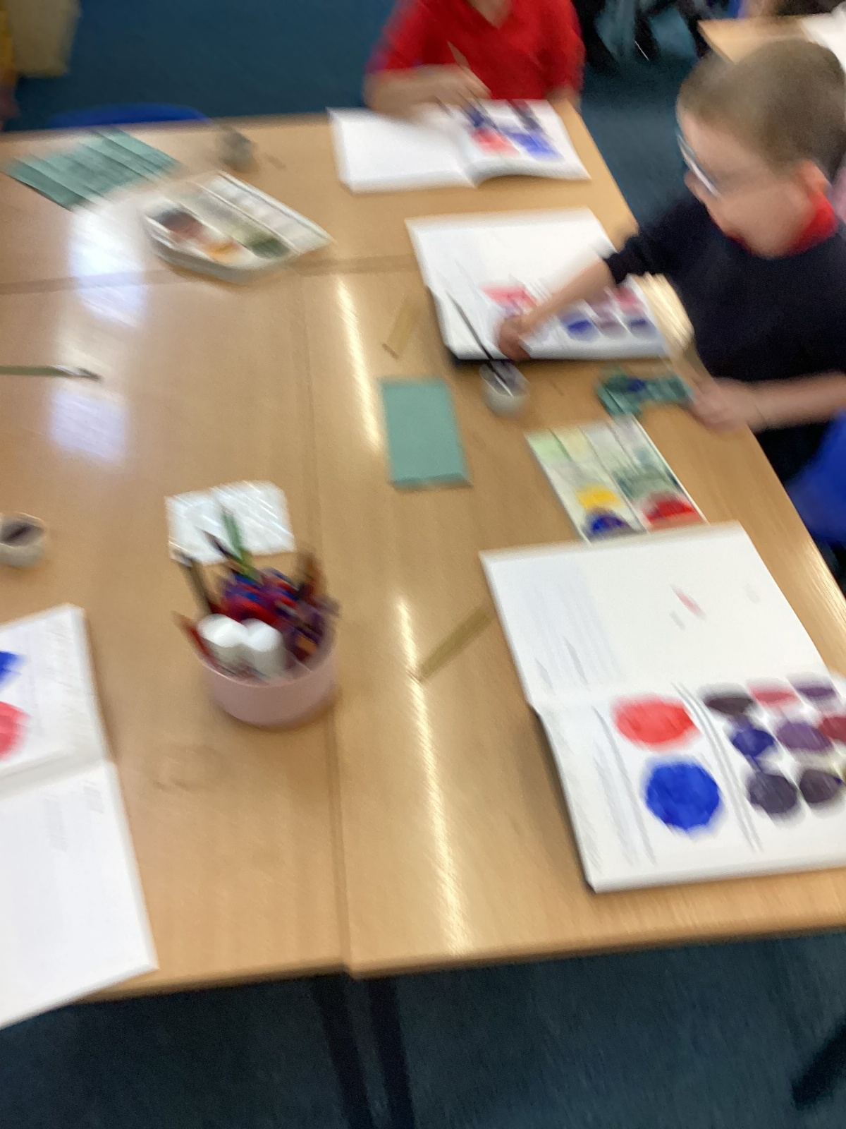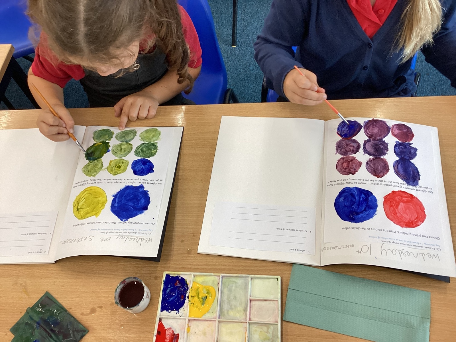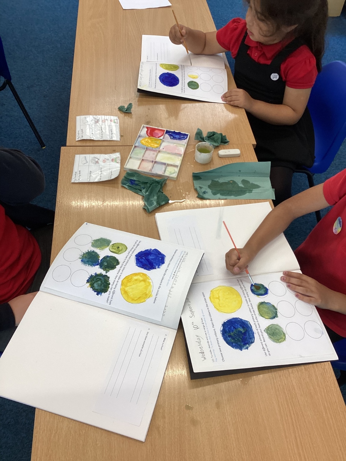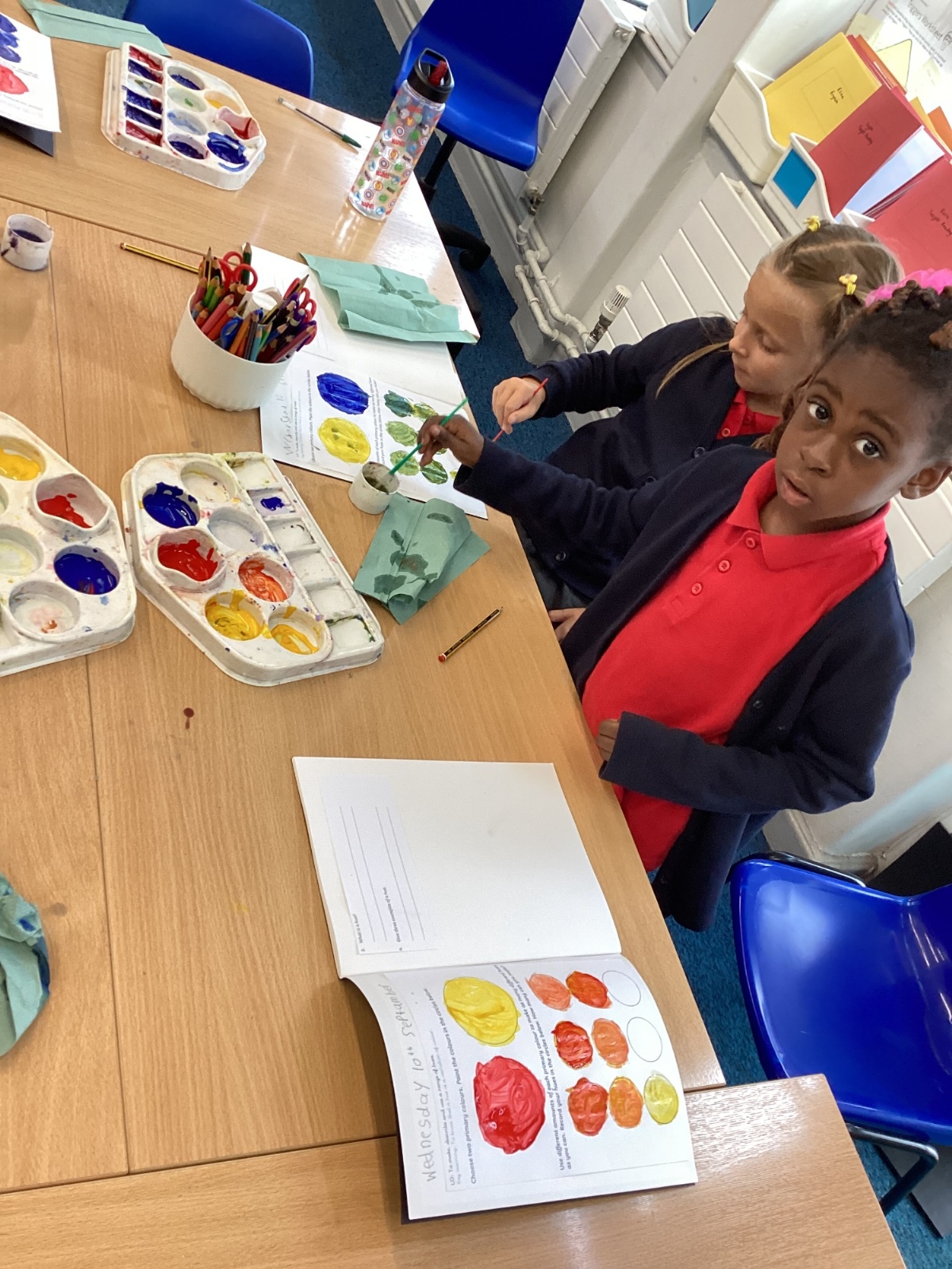 The children were exploring hue's within the colour wheel in art today. They had to pick 2 primary colours and discover what secondary colour they were mixed into. They then experimented with the amount of each colour they would use to create different hue's!