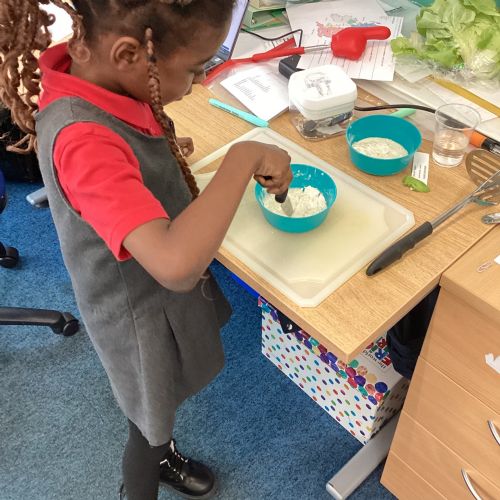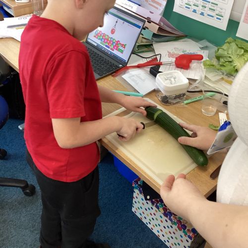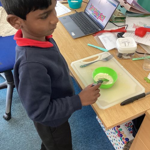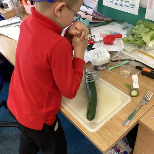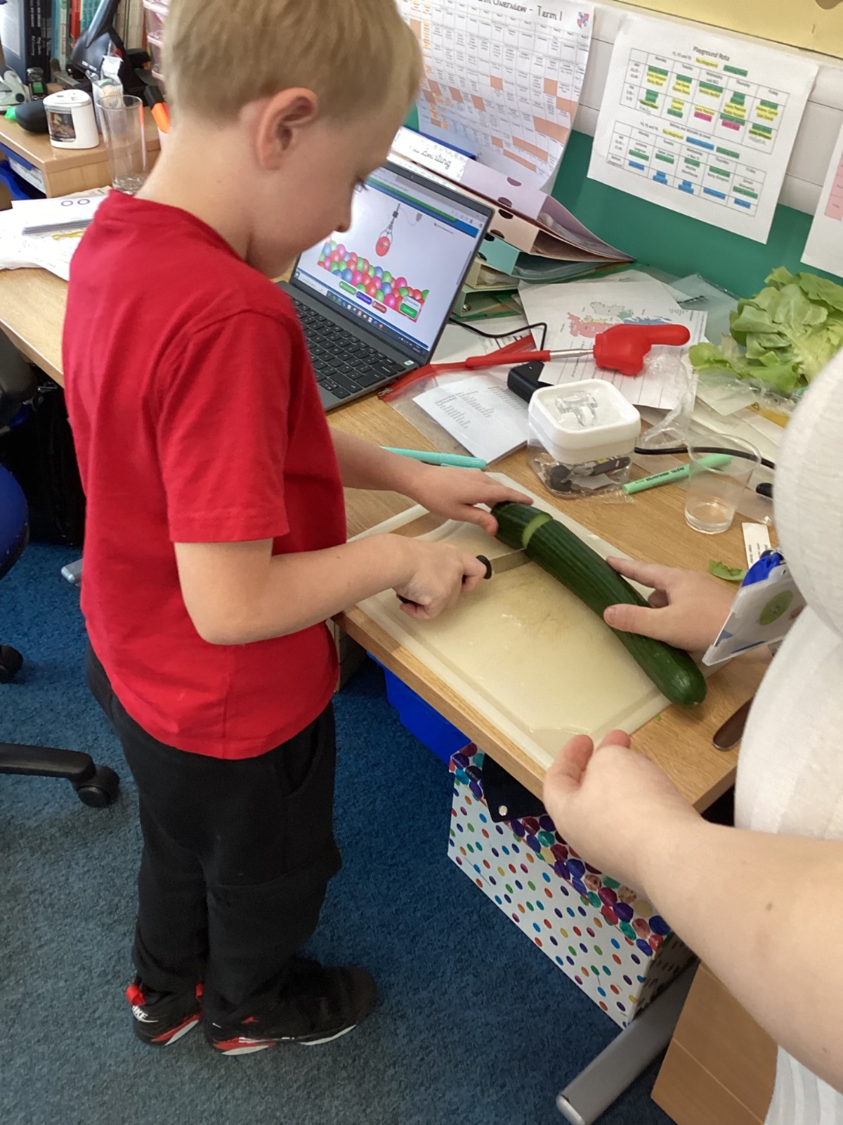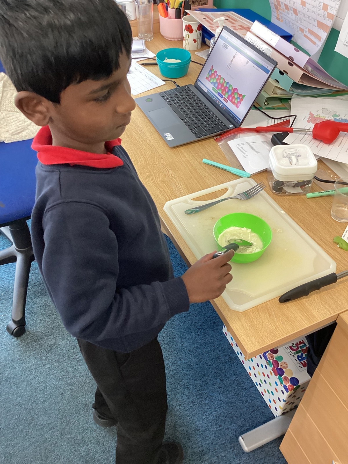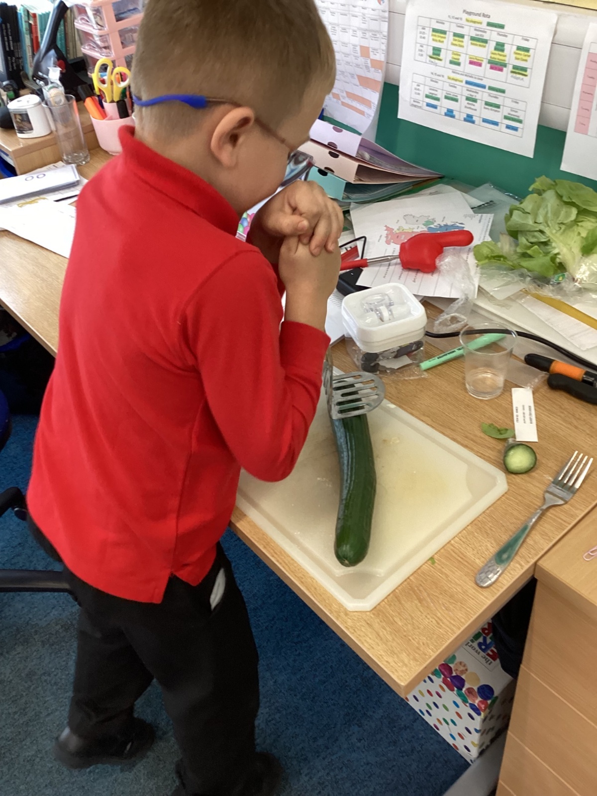 Today in design and technology, the children were experimenting with different kitchen utensils and food. They had to find the most appropriate utensil to prepare the item of food.