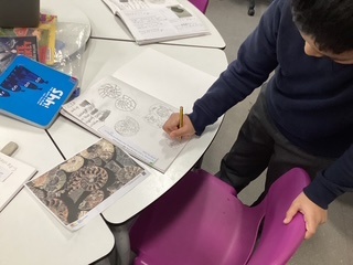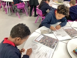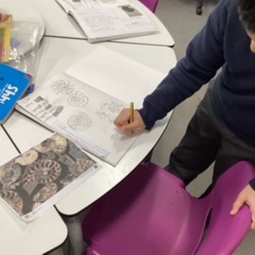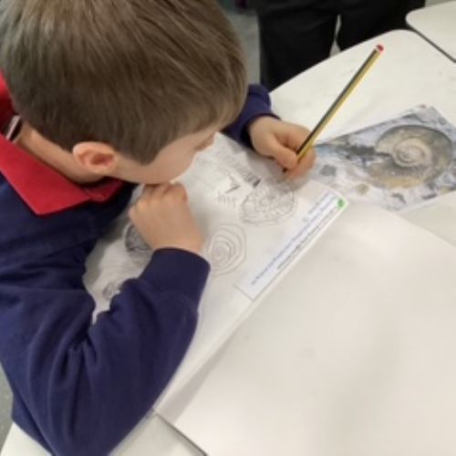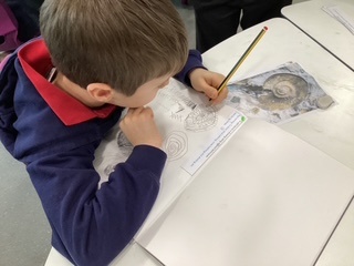 During our art lesson, the children looked carefully at the pictures of fossils and sketched them.