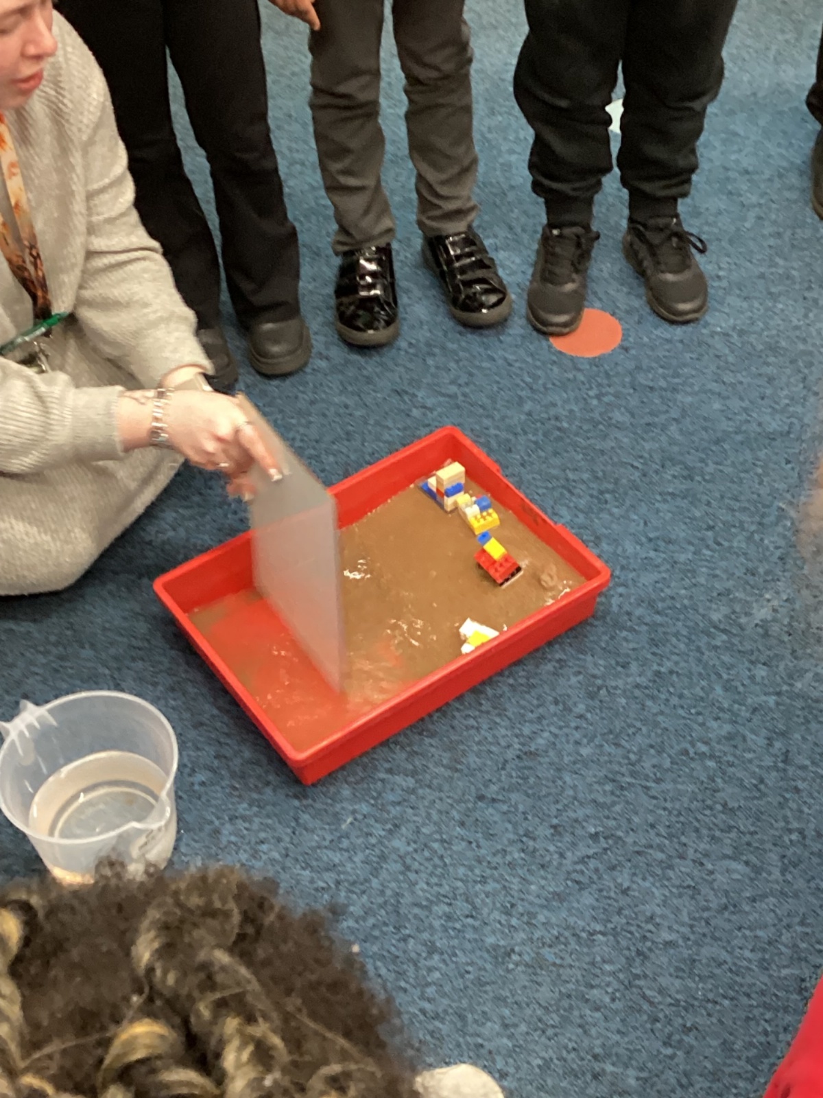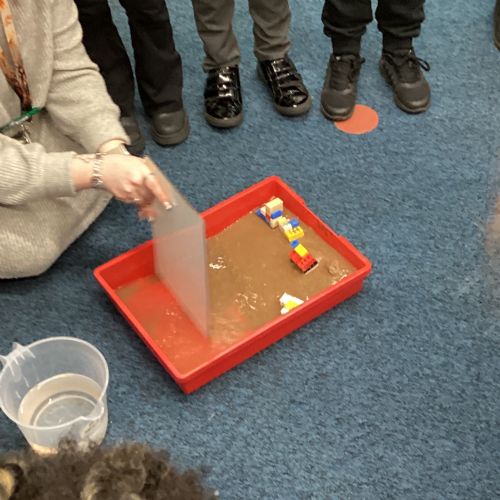 Today in geography the children learnt about erosion. This was then demonstrated with sand and water in a box where waves were made to erode the coast and eventually collapse the buildings.