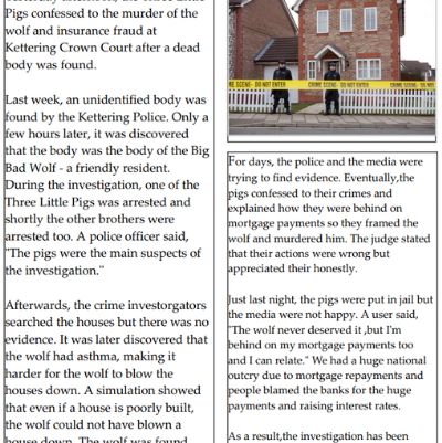 In English, we wrote news paper articles based on a twist of the "Three Little Pigs".