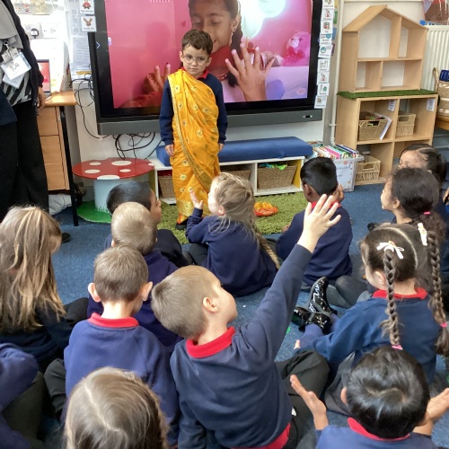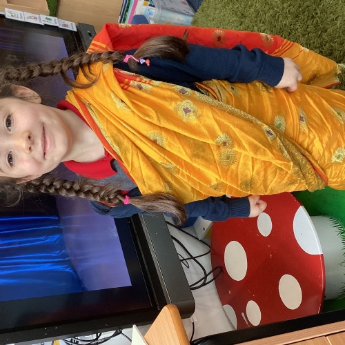 Learning about Diwali - we tried onion bhajis and poppadoms, learnt how to wear a sari and did a Diwali dance!
