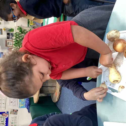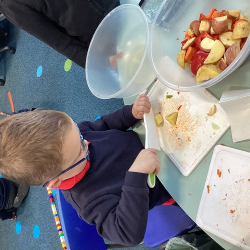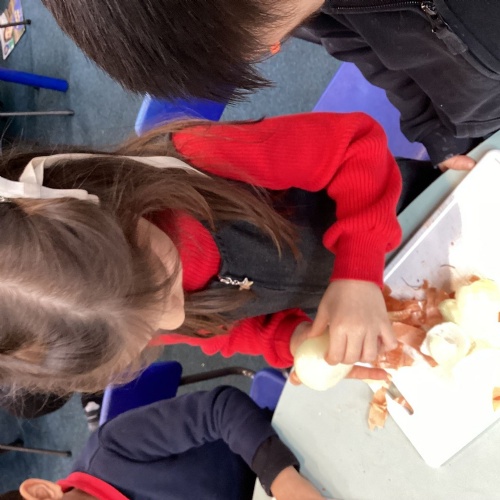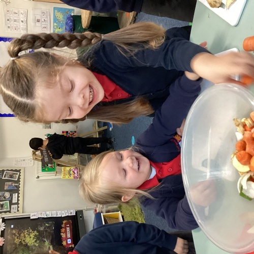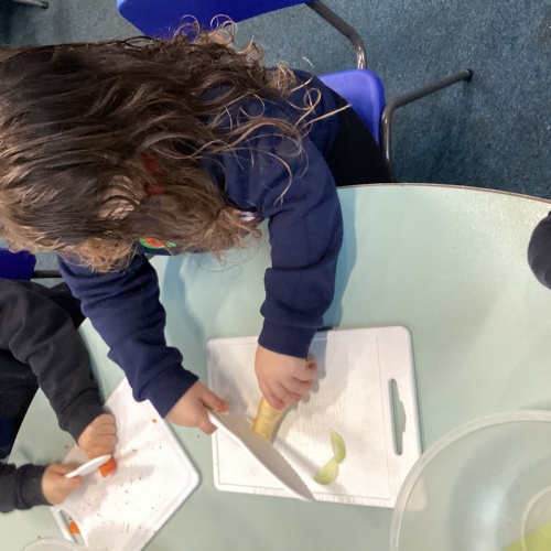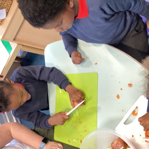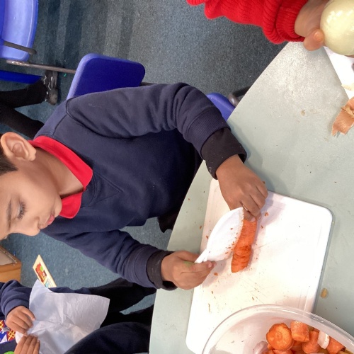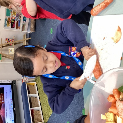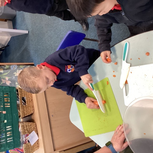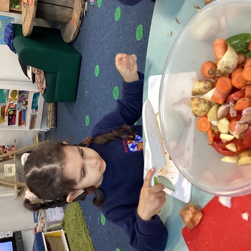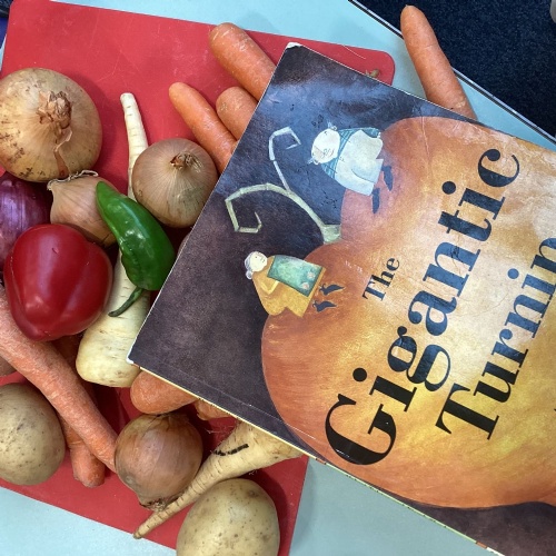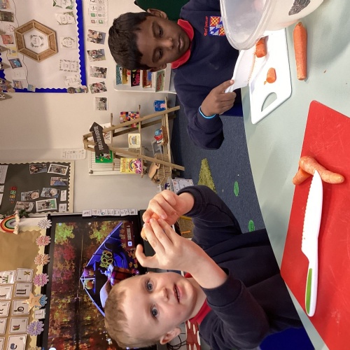 We have been reading The Gigantic Turnip. We chopped up some vegetables and made our own vegetable soup. We had a vote on whether we liked the soup or not!